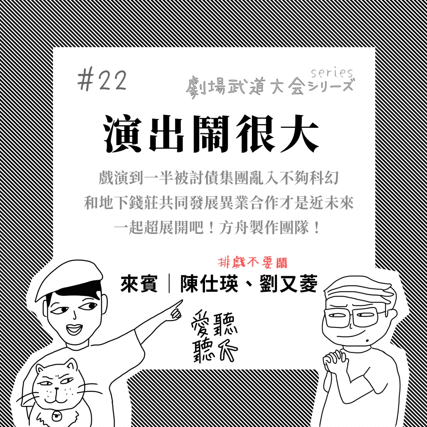 『劇場武道大會series』Round 3,方舟製作團隊駕到。頻道雖然叫做「排戲不要鬧」,但正式演出有夠鬧!來聽聽仕瑛前輩口述演出現場被討債集團入侵超鬧經歷,愛聽不聽強力建言應即刻發展劇場與討債集團的異業合作,以促跨領域循環共榮,順便討論討論老柯和沙宣的攻受屬性?!ㄟ等等,今天好像應該是要宣傳方舟三部曲的全新Remix吧!