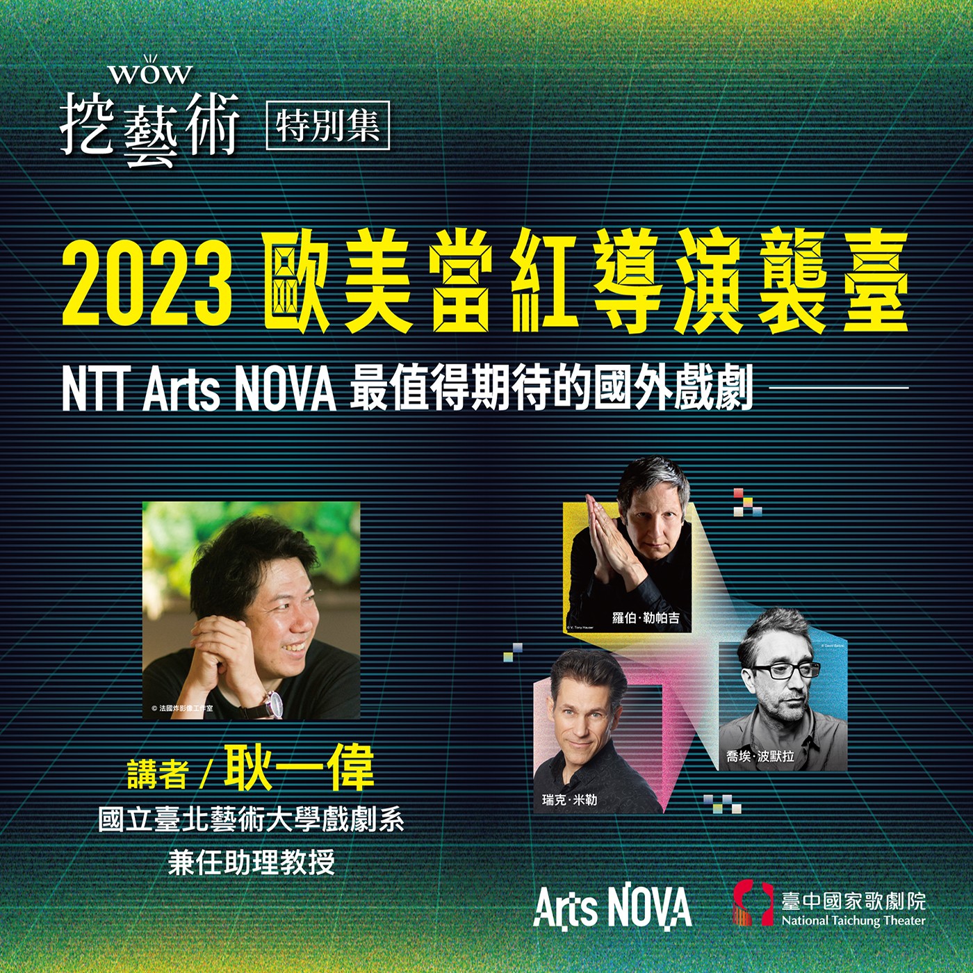 2023 NTT Arts NOVA特別邀請3位歐美當今最令人矚目、充滿新銳觀點的導演,帶來最新創作的戲劇作品,有擅長運用科技與空間巧妙結合的劇場魔法師羅伯.勒帕吉(Robert Lepage)、集編導演於一身,擅長聲音模仿與歌唱,才華洋溢的瑞克.米勒(Rick Miller)、擅於運用各種舞台元素,營造出洗練而精準的劇場美學,只執導自己作品的喬埃.波默拉(Joël Pommerat)。
