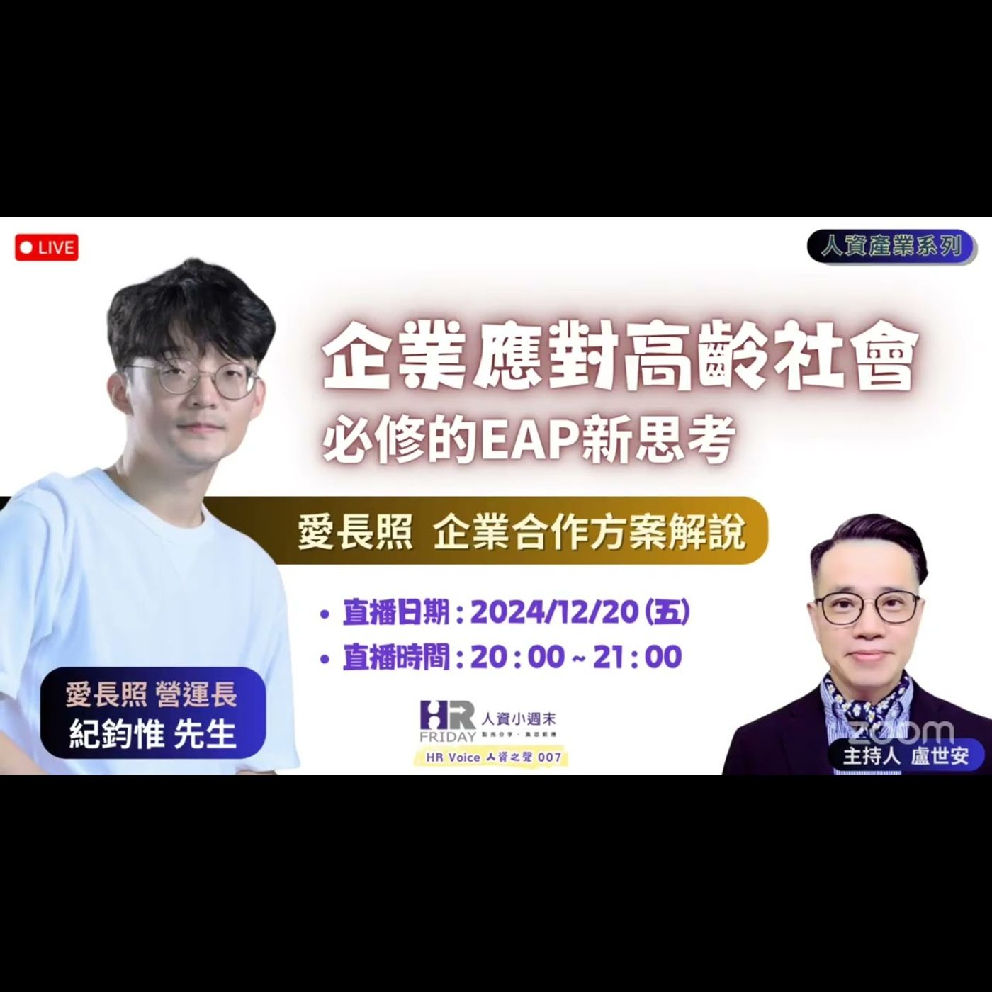 整場活動將透過生動有趣的對話方式,讓觀眾深入了解如何靈活應用EAP工具,從壓力管理到跨世代溝通,為企業和員工創造雙贏的未來。一起透過這場直播,重新審視高齡化挑戰背後的契機,讓我們以創新的EAP新思維,攜手開創更包容、更具韌性的未來企業藍圖!