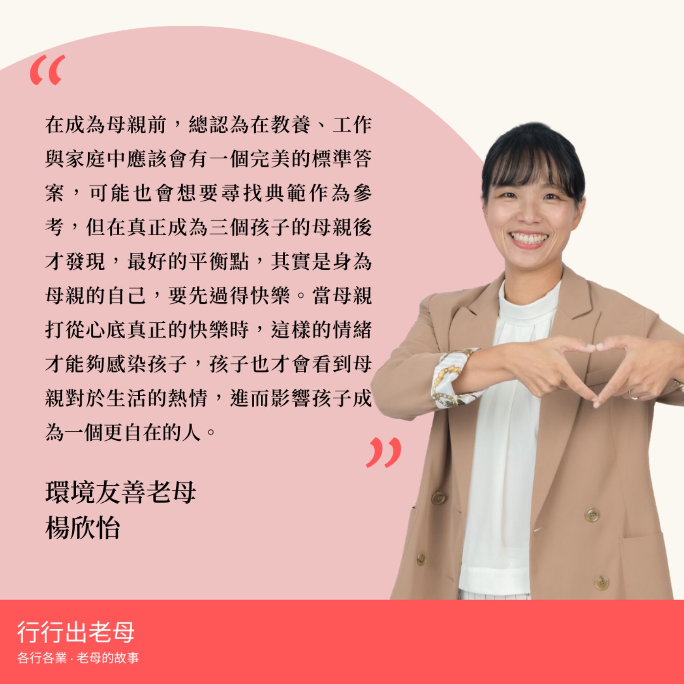 本週我們很榮幸邀請到【環境友善老母,楊欣怡】來到行行出老母的節目,欣怡要來和我們分享自己的人生斜槓故事,如何從街頭拍攝紀錄片走入創業,創辦Home Work 家務室,推廣環境友善的生活方式,再到參選市議員,一路向廣大選民闡述自己對於守護環境的決心。如果你也對環境友善的議題有興趣,那就和我們一起收聽本週的節目吧!