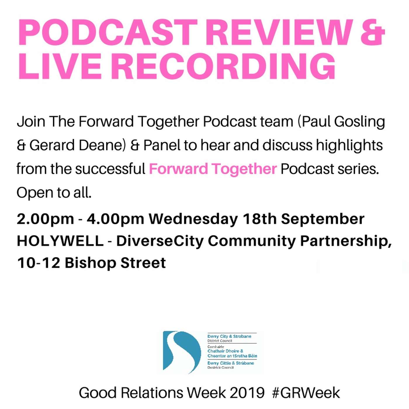 Information on our upcoming Forward Together Podcast event taking place at 2.00pm on 18th September at Holywell Trust, 10-12 Bishop Street, Derry. The event is open for all to attend and we'll hear highlights from our series and have a discussion with our panel made up of Paul Gosling, Denis Bradley, Maureen Hetherington (The Junction) and Julieann Campbell (Museum of Free Derry).
