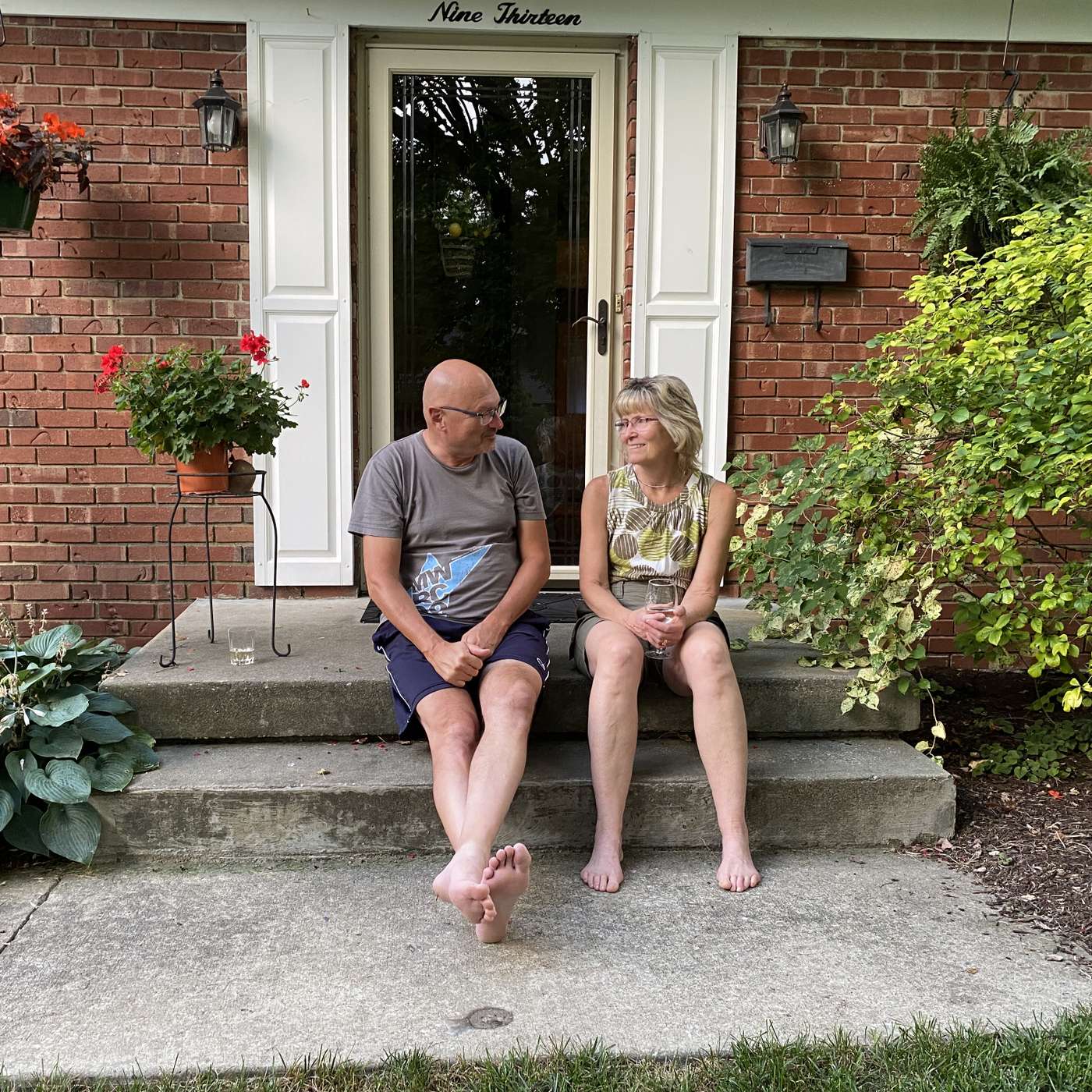 The picture is of Dawn and me sitting on our "Stair Seat", where we observe the activity on our lawn, sidewalk, and street. Which mainly consists of birds, squirrels, and people walking dogs. But it still fits Christopher Alexander's pattern of that name.