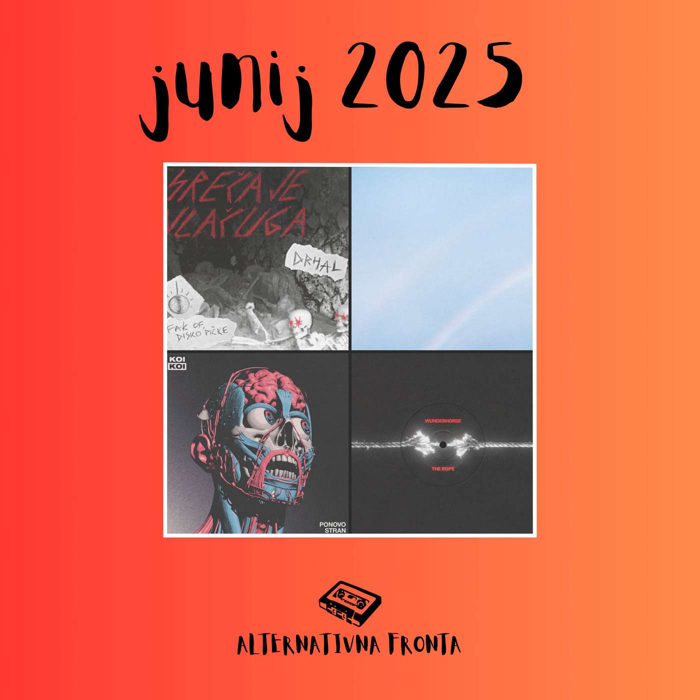 Alternativna fronta vstopa v poletje! V naši junijski epizodi se osredotočamo bolj na kitarsko godbo, saj nas je ta v zadnjem mesecu najbolj pritegnila. Za ljubitelje bolj raznolike muzike pa je tu mesečna playlista kjer lahko najdete večjo glasbeno raznovrstnost. V prvem delu epizode smo obravnavali novi album zasedbe Turnstile, ter najnovejši single britanskega benda Wunderhorse. V drugi polovici oddaje pa smo se bolj posvetili alternativni glasbi iz regije. Poslušali smo novo ljubljansko pank sestavo Drhal, ter beograjske indie ljubljence KOIKOI. Poleg omenjenih pa na naši vsakomesečni playlisti najdete še celo vrsto najboljšega kar je v tem mesecu ponudila alternativna glasba. Vabljeni k poslušanju!