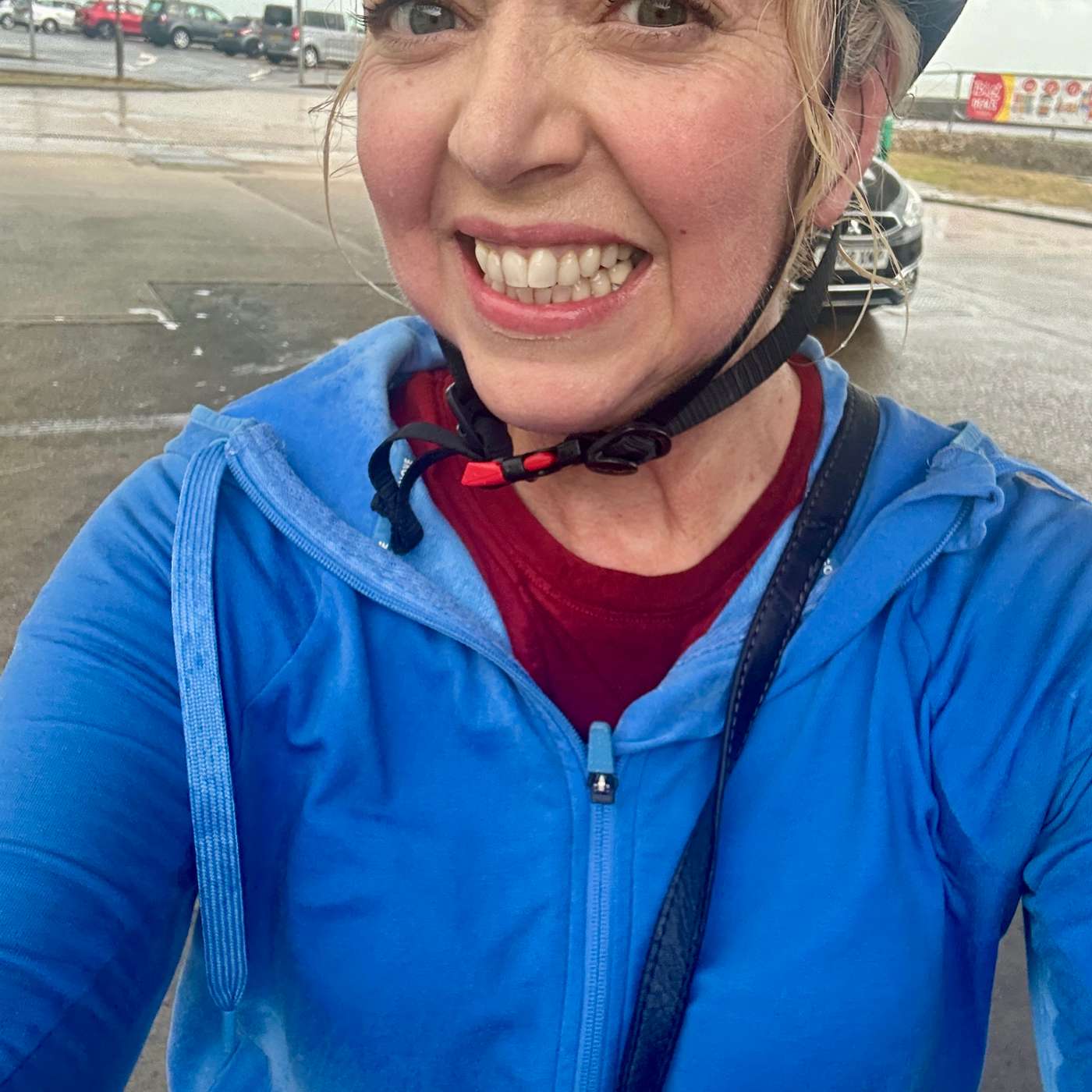 This episodes photo is her hiding under a garage forecourt after being caught in a rainstorm on her cycle home from the gallery. #keepingitreal