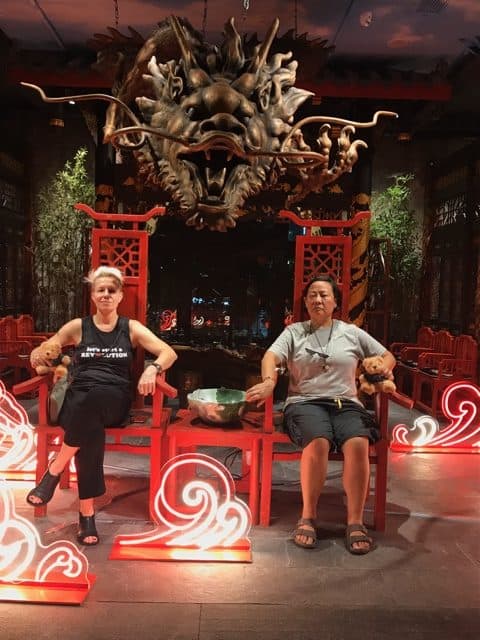 Anita is pictured with Elizabeth Falkner in the red chairs in Shanghai