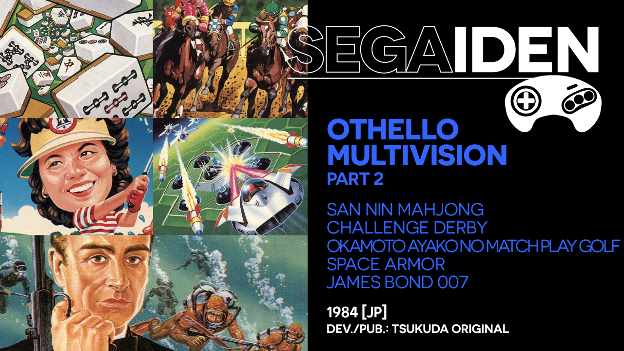 Well, I survived. I made it all the way through the Othello Multivision's library. If you thought the first four games were unimpressive, that's only because you had no idea what Tsukuda Original had up its sleeve for 1984: Yet another mahjong game, a glacial Xevious clone, and Video Works' very first (of many...) horse race-betting sim. But at least there's a somewhat inventive golf title and a solid conversion of a beloved (albeit crazy difficult) James Bond game. This version fixes a titling error from the previous upload.