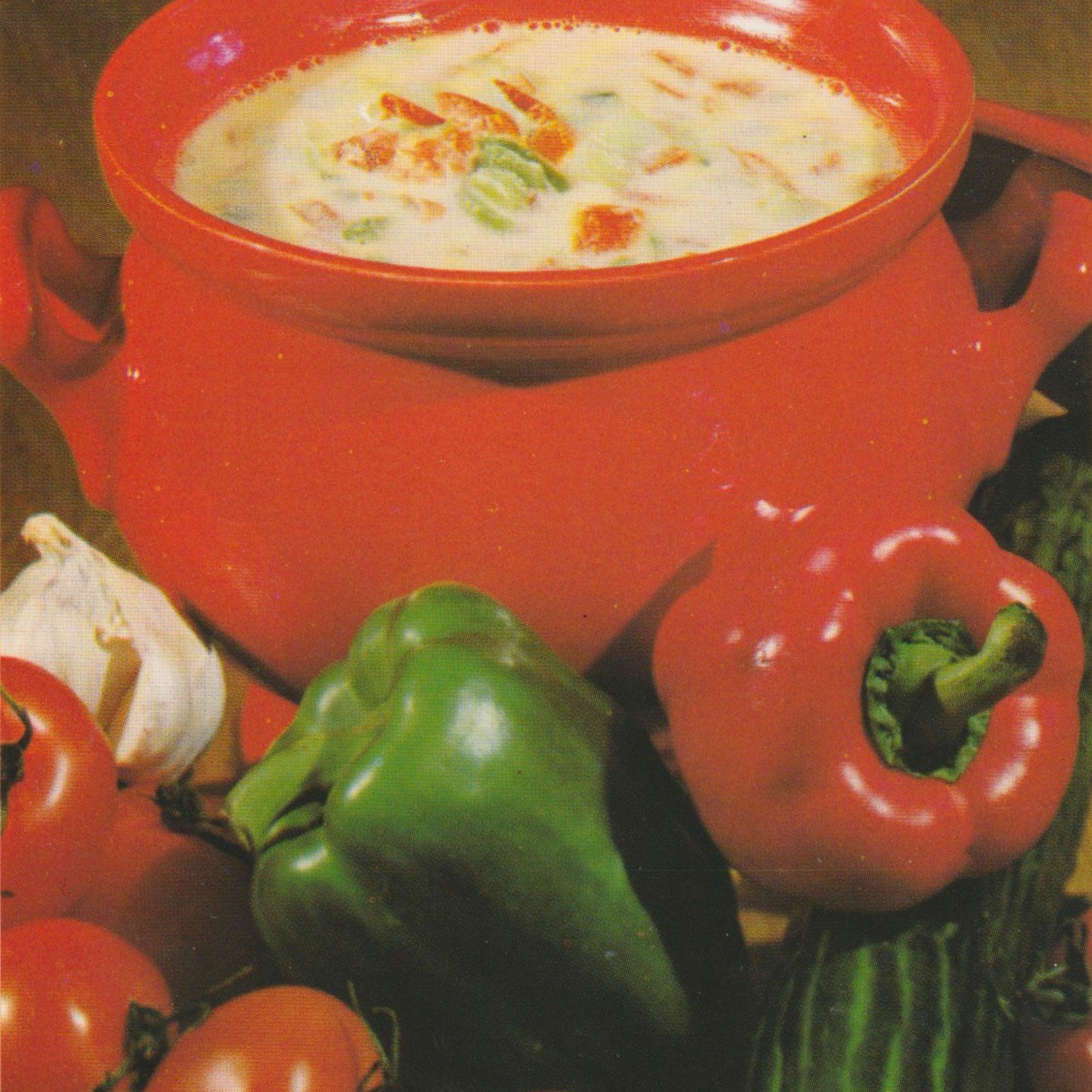 Vor dem Servieren zu den Gemüsestücken in die Tasse gießen und die Suppe kaltstellen. Mit den frisch gerösteten Croutons servieren.