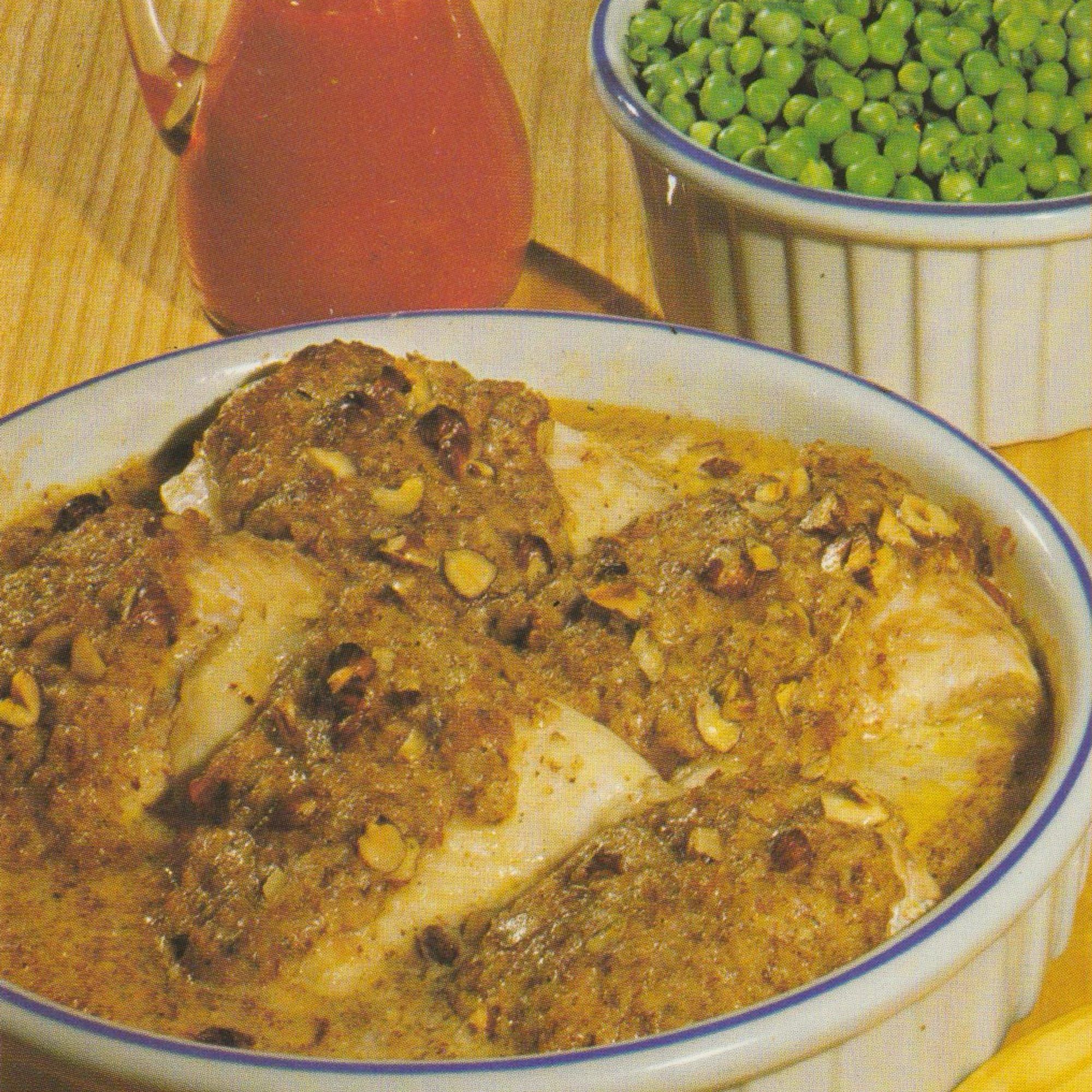 In eine gut ausgebutterte feuerfeste Form geben. Vier Nüsse zu Blättchen schneiden, den Rest mahlen und mit Käse, Milch und Sherry vermischen. Mit Muskat würzen. Die verbliebene Butter schmelzen und zusammen mit der Nuß-Käse-Masse über den Fisch gießen. Mit Alufolie abdecken und im vorgeheizten Ofen ca. 25 Minuten garen. In den letzten fünf Minuten die Folie abnehmen und die Oberfläche leicht bräunen lassen.