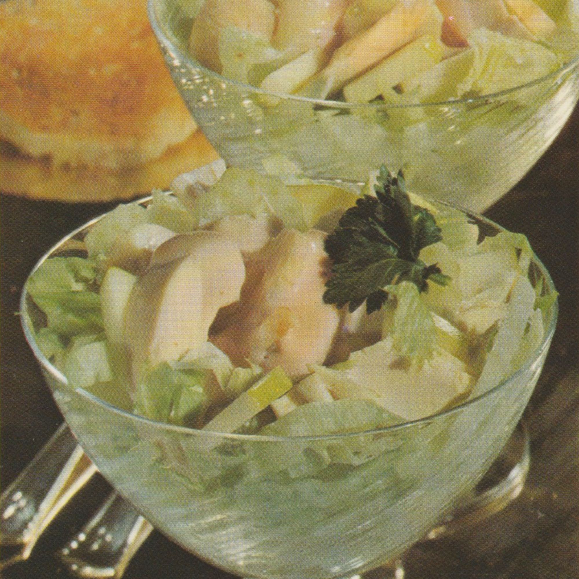 Bildbeschreibung: Cocktailschalen mit geschichtetem Geflügelsalat auf Salatblättern, garniert mit Petersilie. Im Hintergrund weitere gefüllte Glasschalen mit Hähnchen–Staudensellerie–Salat und Weißbrotscheiben auf einem Teller.