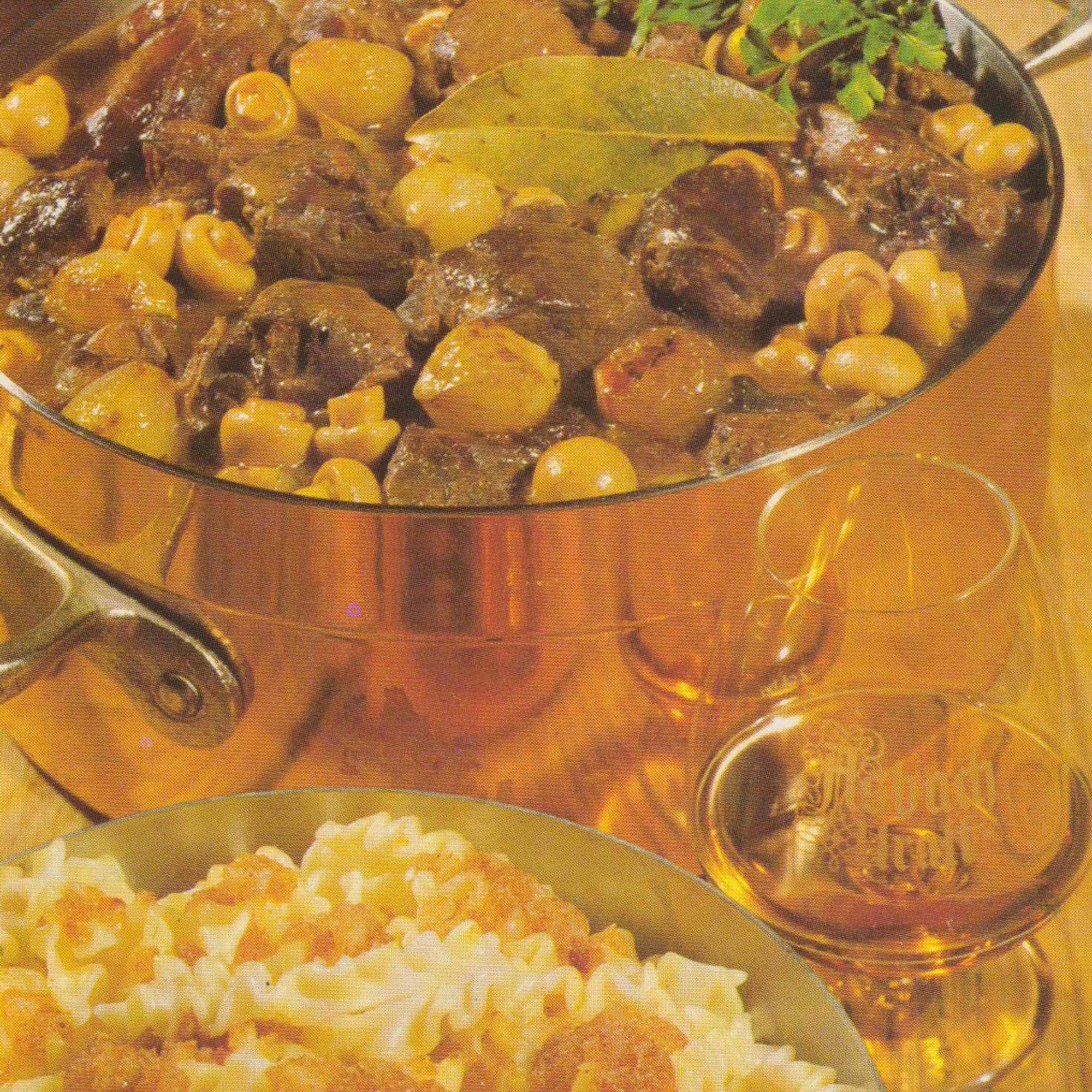 Bildbeschreibung: Kupferfarbener Schmortopf mit Hasenpfeffer: dunkle Fleischstücke in brauner Sauce mit Champignons, kleinen Zwiebeln, Nudeln und Lorbeerblatt. Daneben ein Glas Bier und ein Teller mit Butternudeln, bestreut mit geröstetem Zwiebackmehl.