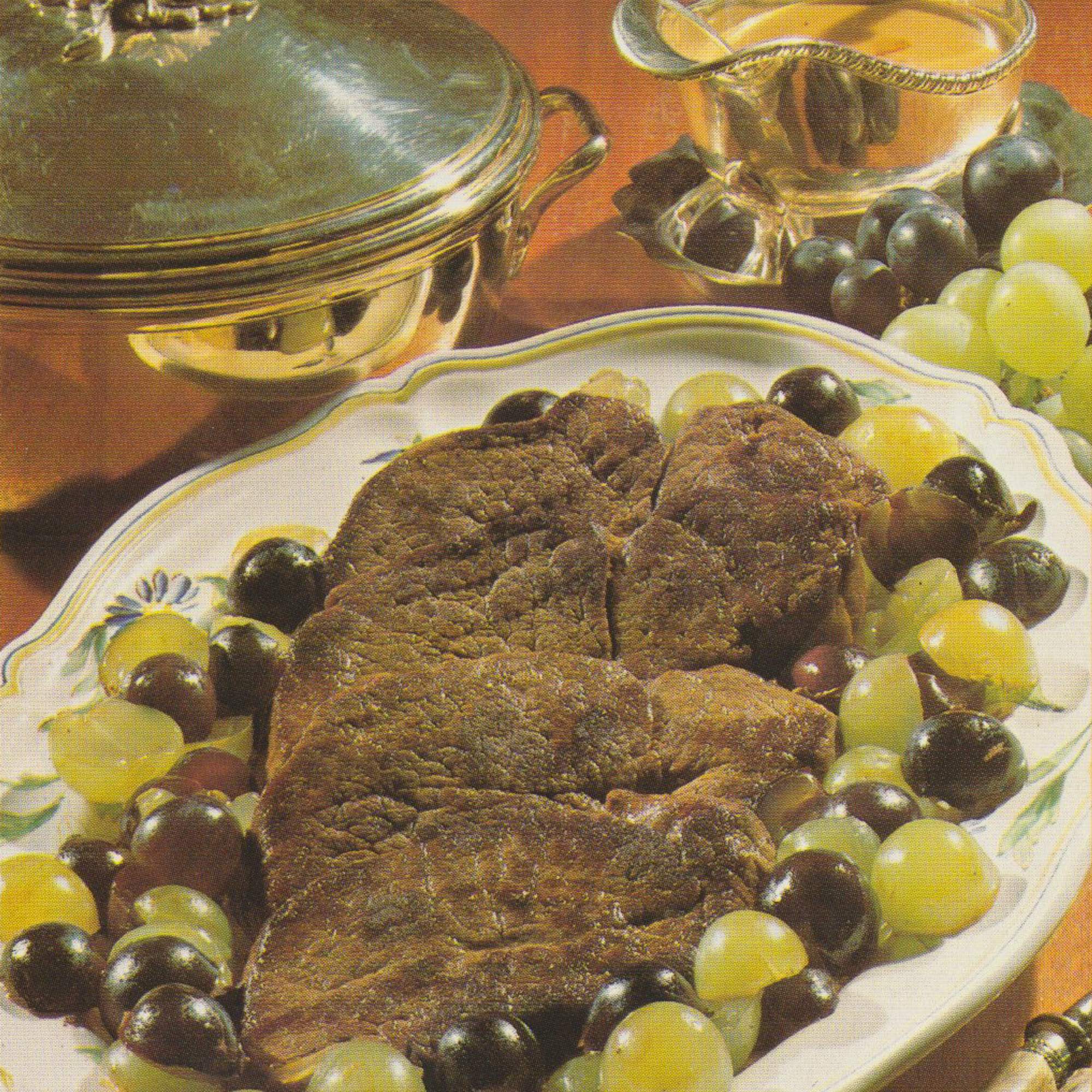 Bildbeschreibung: Vier gebratene Hirschsteaks auf einem ovalen Teller mit gelb-grünem Blumenmuster, umgeben von halbierten grünen und dunklen Weintrauben. Im Hintergrund eine goldene Servierschüssel mit Deckel und eine Sauciere mit Weintrauben-Dekoration.