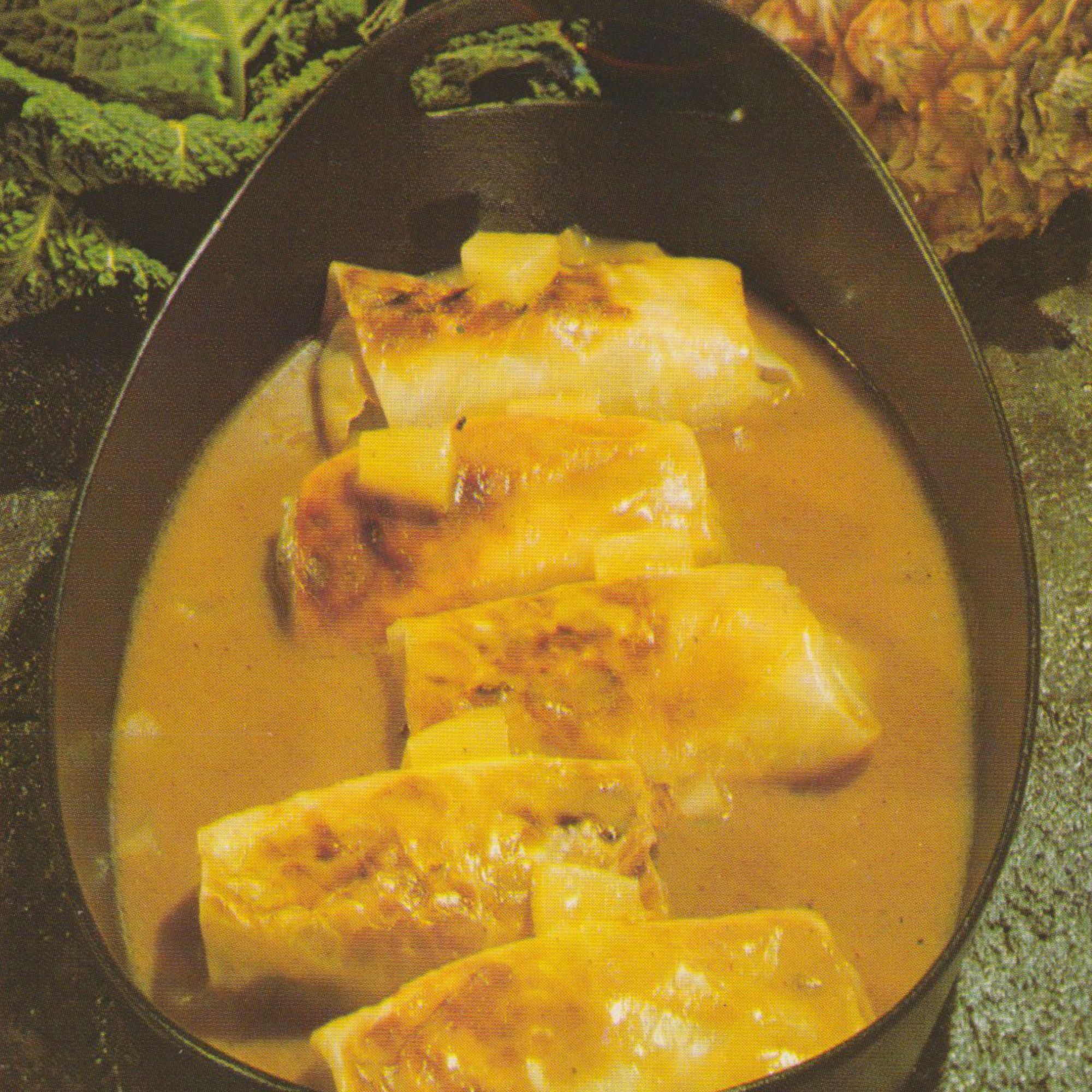 Vier große Kohlblätter ausbreiten, je eine Scheibe Käse hineinlegen und darauf die Fleischmasse verteilen. Die Rouladen in der üblichen Weise zusammenschlagen und als Bündel mit dünnem Zwim um-wickeln.