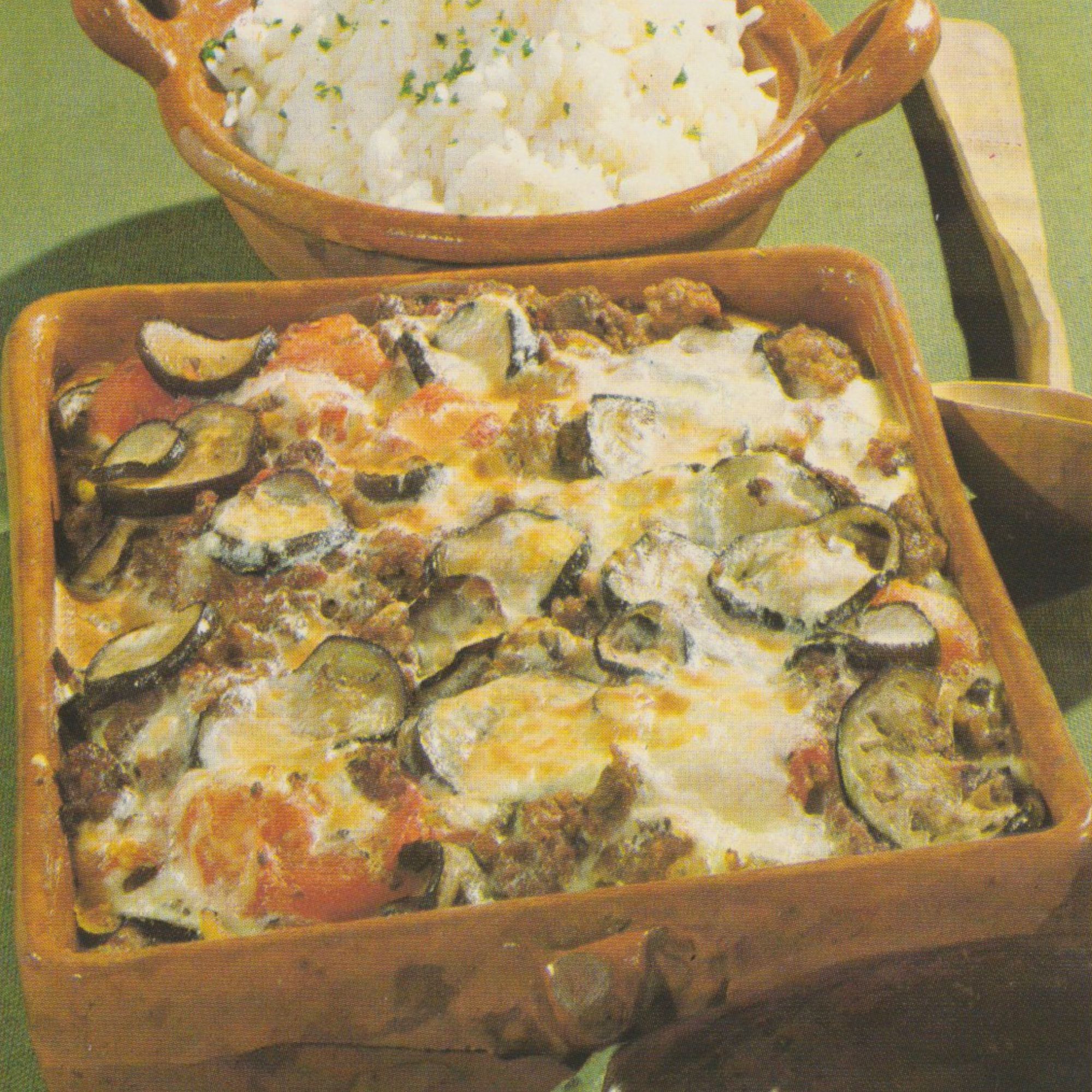 Auberginen putzen, waschen und in Scheiben schneiden. Kurz in der Pfanne in Öl anbraten und anschließend mit dem Öl in einer feuerfesten Form verteilen. Die in Scheiben geschnittenen Zwiebeln darüberschichten, gehackten Knoblauch darüberstreuen und die klein-geschnittenen Fleischstücke zugeben. Tomaten in kochendem Wasser überbrühen, häuten, halbieren und zwischen das Fleisch legen. Salzen, pfeffern und reichlich Oregano zugeben.