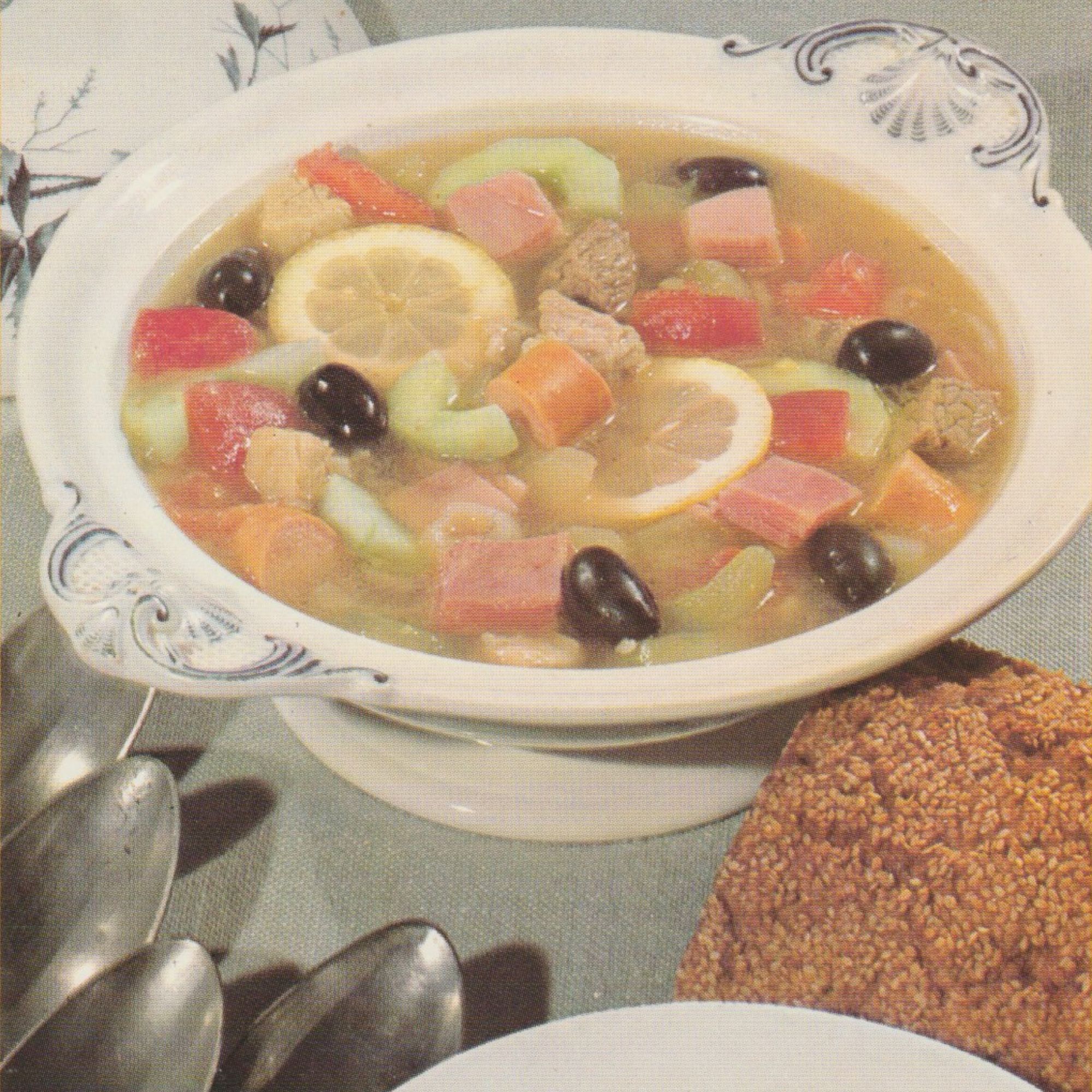 Bildbeschreibung: Eine klare Suppe mit Zitronenscheiben, Selleriestücken, Karotten, Fleisch und schwarzen Oliven wird in einer weißen Suppenterrine mit Schnörkeldekor serviert. Daneben liegen mehrere Löffel und ein mit Sesam bestreutes Brot.