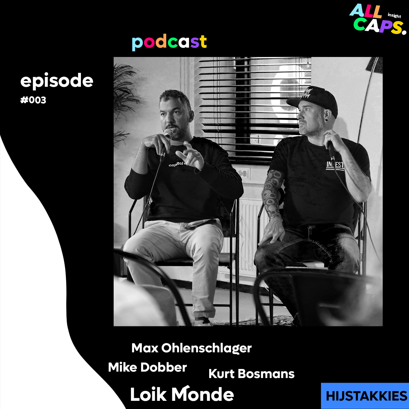 Ligt de toekomst van street art nog wel op straat? Of is er ook een plek indoor weggelegd? Hoe ontstaat een street art-festival en wat is het belang van verschillende street art-festivals door heel Europa? En wat zijn nou de verschillen in aanpak? Presentator Max Ohlenschlager vraagt het Kurt Bosmans (Street Art Festival, Hasselt), Loïc Monde (Expo Lay Up, Toulouse) en Mike Dobber (Step In The Arena, Eindhoven), in de derde aflevering van de HIJStakkies podcast-special die tijdens ALL CAPS werd opgenomen.