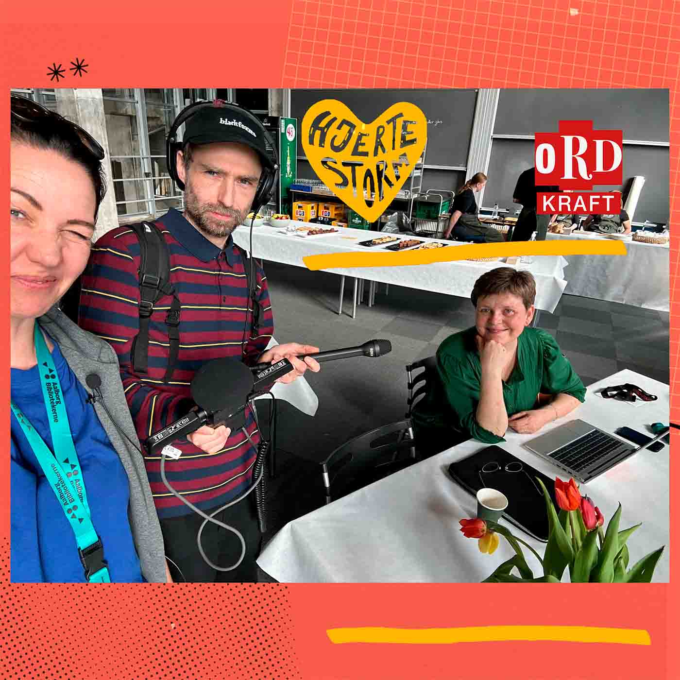 Hjertestorm var forbi Ordkraft, både inden og under. Her fik vi en snak med de mange engagerede kræfter bag, og hørte nærmere til, hvad de forskellige scener og områder indeholder. Anine, som er projektleder fortæller sammen med Vita omkring de mange måneders forberedelse, og bl.a. dette års internationale samarbejde. Maria og Rebecca giver os et spændende indblik i Bibliotekernes Scene og om det tværfaglige samarbejde der er mellem Nordjyllands biblioteker. Jes og Sørine beretter lystigt om Generatorscenen, som er den frække lillesøster-scene, som i år var på Center for Jazz. Under afviklingen mødte vi et par livlige unge frivillige, samt et par glade gæster, moderatoren Ralf Gottschalk mm.