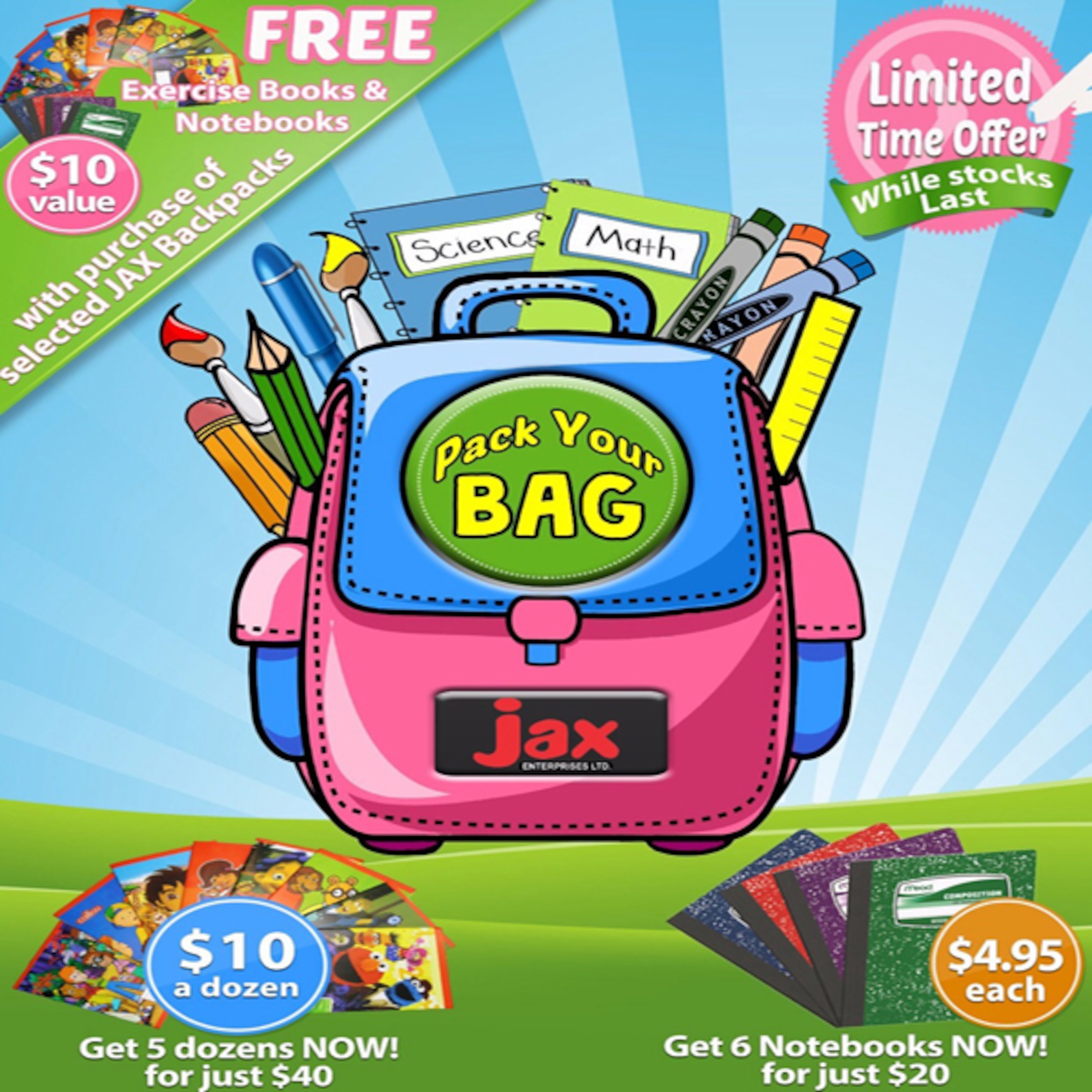 Pack your JAX Backpack for Back-To-School and get Exercise Books or Notebooks FREE! Just look for the JAX Pack-Your-Bag sales tag!