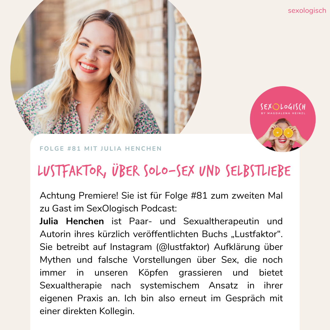 Julia Henchen ist Paar- und Sexualtherapeutin und Autorin ihres kürzlich veröffentlichten Buchs „Lustfaktor“. Sie betreibt auf Instagram (@lustfaktor) Aufklärung über Mythen und falsche Vorstellungen über Sex, die noch immer in unseren Köpfen grassieren und bietet Sexualtherapie nach systemischem Ansatz in ihrer eigenen Praxis an. Ich bin also erneut im Gespräch mit einer direkten Kollegin. :)