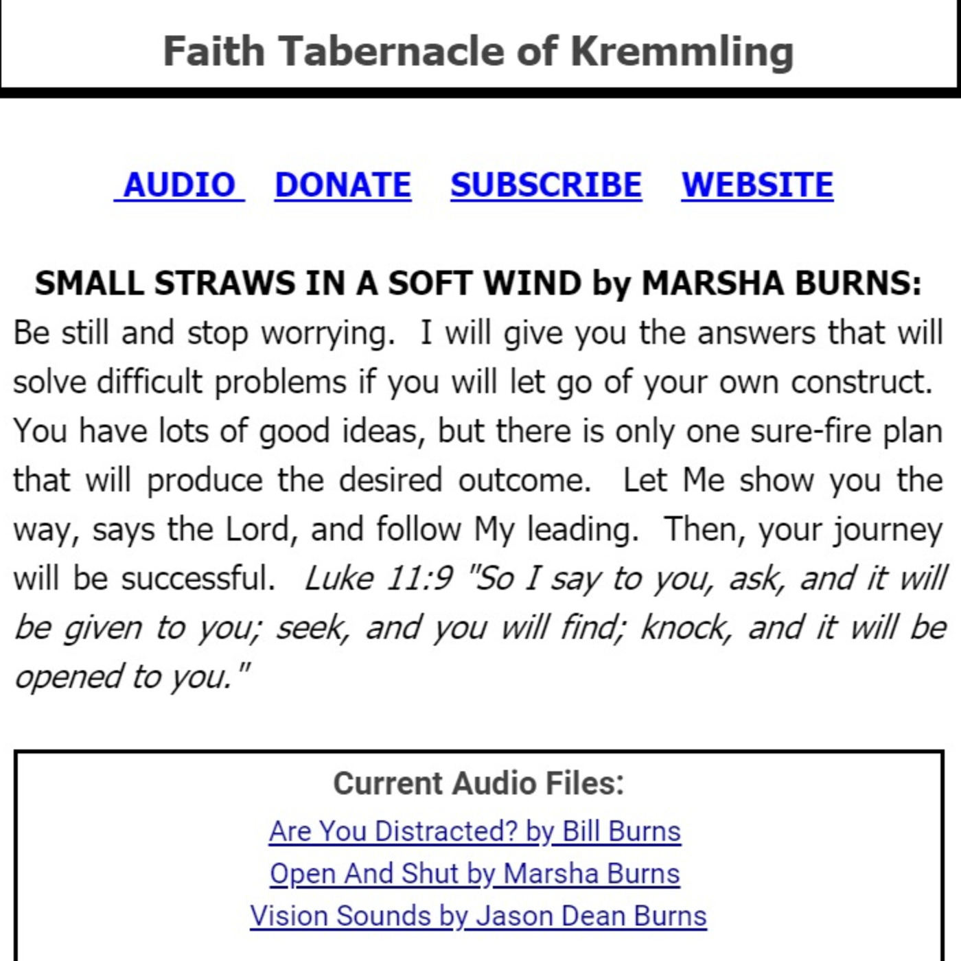 "Be still and stop worrying. I will give you the answers that will solve difficult problems if you will let go of your own construct. You have lots of good ideas, but there is only one sure-fire plan that will produce the desired outcome. Let Me show you the way, says the Lord, and follow my leading. Then, your journey will be successful. Luke 11:9 'So I say to you, ask and it will be given to you; seek, and you will find; knock, and it will be opened to you.'"