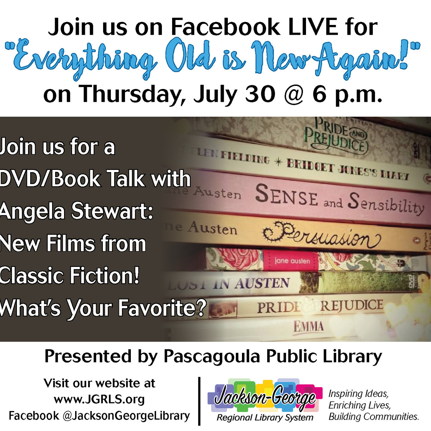 Listen to a DVD/Book Talk with Pascagoula branch manager Angela Stewart. She will discuss New Films from Classic Fiction and the many trends in film currently available on-line. What’s Your Favorite? Presented by the Pascagoula Public Library.