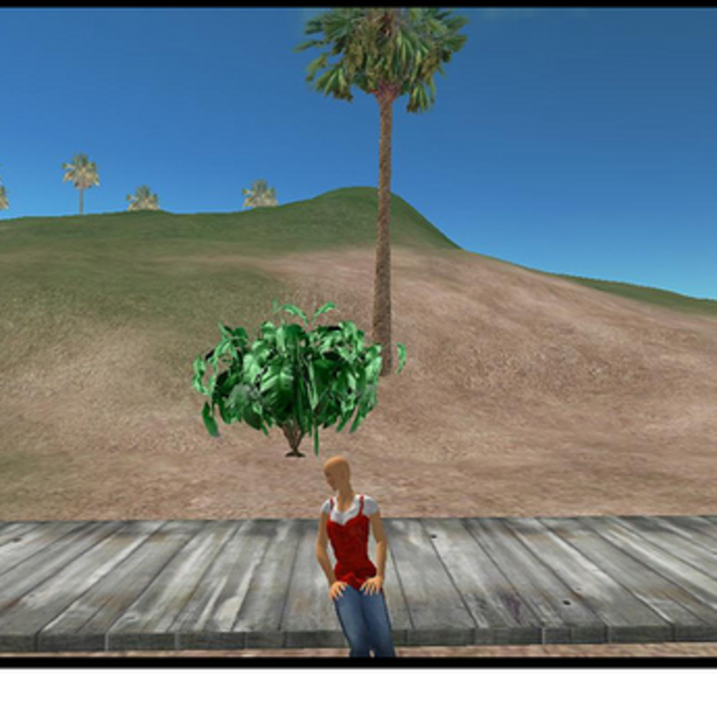 Picture 8: The panorama or landscape is big in size. The landscape is full of tropical colours and vegetation. The shape of the horizon is molded by some hills. The purpose is maybe the construction of a vacation home. The length and width of the road in the picture is appropriate for low traffic. The vehicles can't develop high speed. The panorama resembles a place away from an urban center. We can see some vegetation above the hills. There is a little bush beside the palm tree. Dafne is near the road.