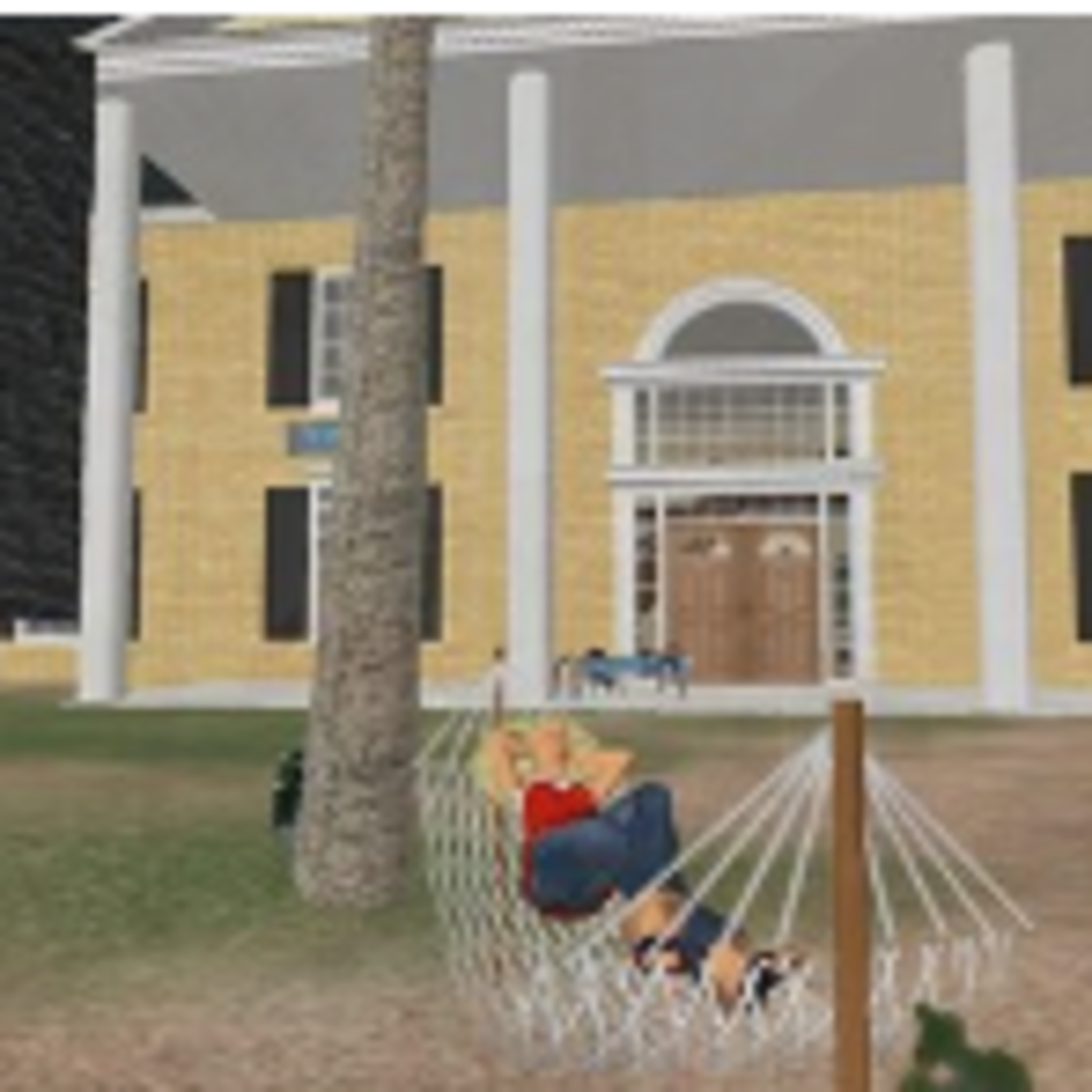 This is an image of Metaverse slideshow. In the image, we can see the backyard of a yellow house. The place has a lot of grass and trees. It`s a very quite and relaxing yard. In the bottom, we can see a big yellow house. It has southern style. The house has two floors of height. There are four tall white columns in front (in the image we see three columns but house should has four). The windows of house are very big and the door too. In the center, there is a woman rests in a hammock. She dresses a red blouse and blue jeans. She has black sandals. The hammock is hanging of two stakes. The hammock is made of cotton. The woman rests so quietly over the hammock. This image seems the sense of peace and stillness.