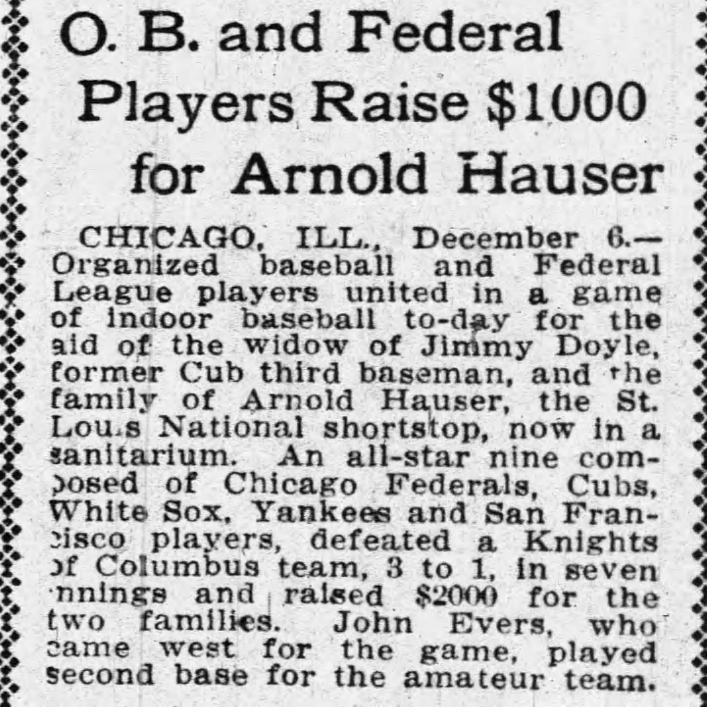 On this date in 1914, a team of Federal League and Organized Baseball stars took on the Knights of Columbus in an indoor baseball game to benefit the families of the Cubs’ Jimmy Doyle, who died from a burst appendix, and the Cardinals’ Arnold Hauser, who was confined to an insane asylum.