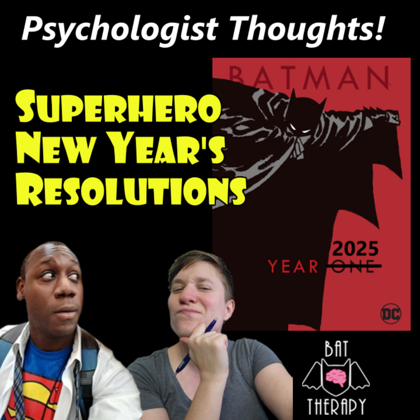 The Bat Therapy co-hosts reflect on the past year. Hear a psychologist’s suggestions for maintaining those New Year’s Resolutions as we compare ourselves to our favorite superheroes. We also share our most listened to episodes during 2024!