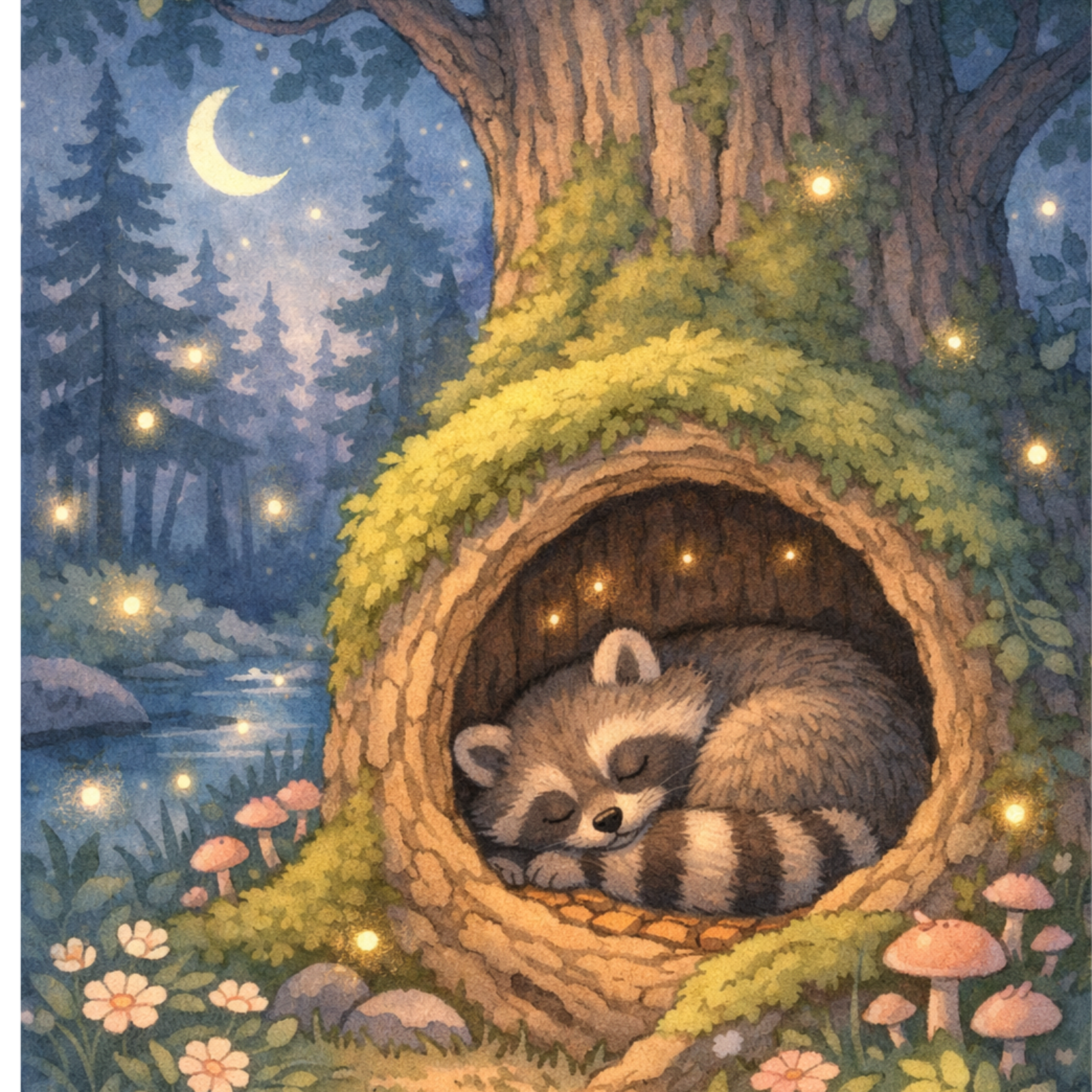 Tonight’s gentle story follows Rowan, a curious raccoon who wanders through moonlit forests, quiet rivers, and soft meadows in search of the coziest place to rest. Along the way, Rowan learns that the softest night isn’t found by wandering farther—but by listening closely and knowing when it’s time to stop.