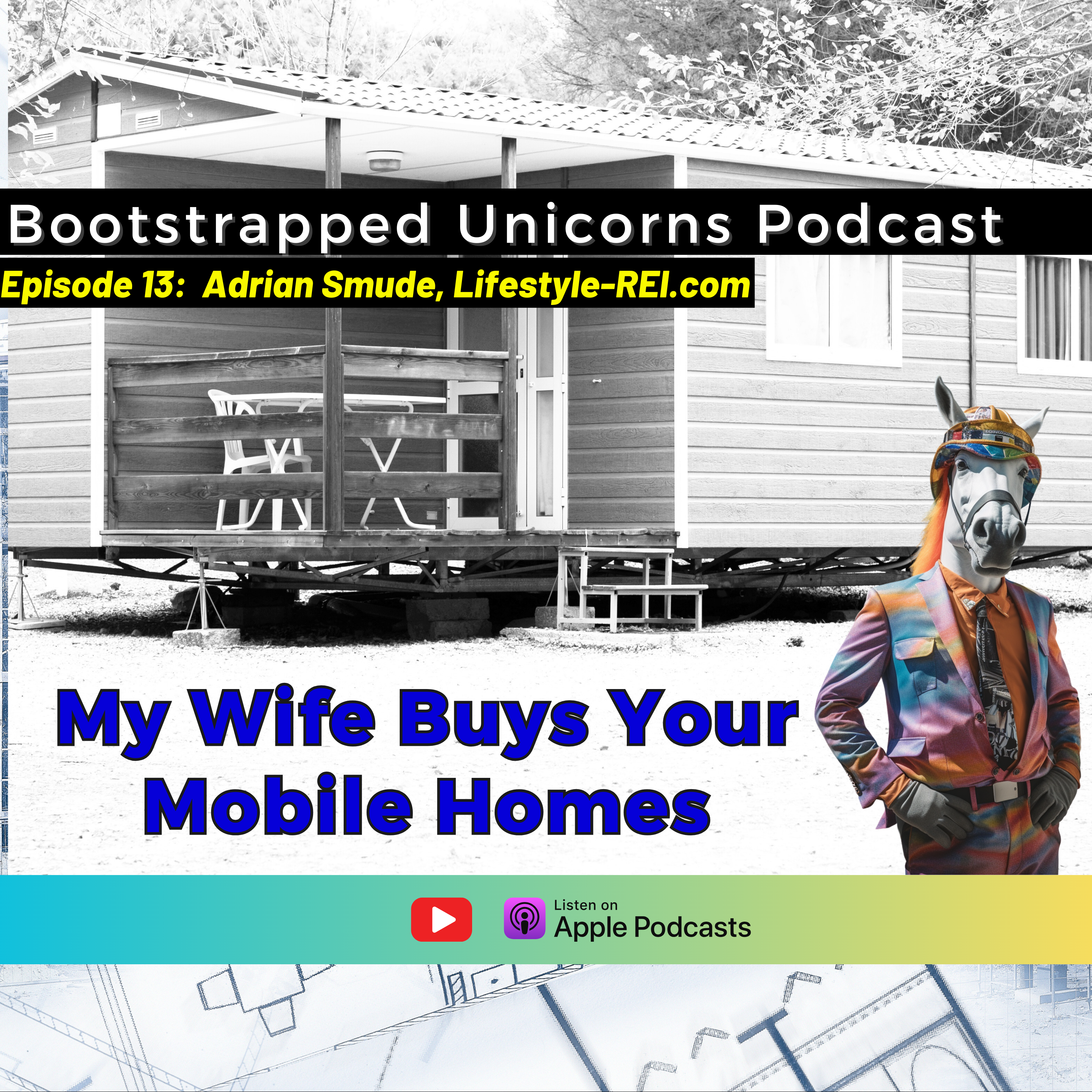 Welcome to episode 13 of the Bootstrapped Unicorns podcast! In this episode, host Josh Pies interviews Adrian Smude, owner of Lifestyle REI. Adrian, who can regularly be seen wearing an attention grabbing shirt that says "My Wife Buys Mobile Homes", which just happens to be the name of his other business, is a real estate investor, educator, and author. He also knows when to take advantage of a creative branding opportunity. Tune in - this is a guy you want to hear from!