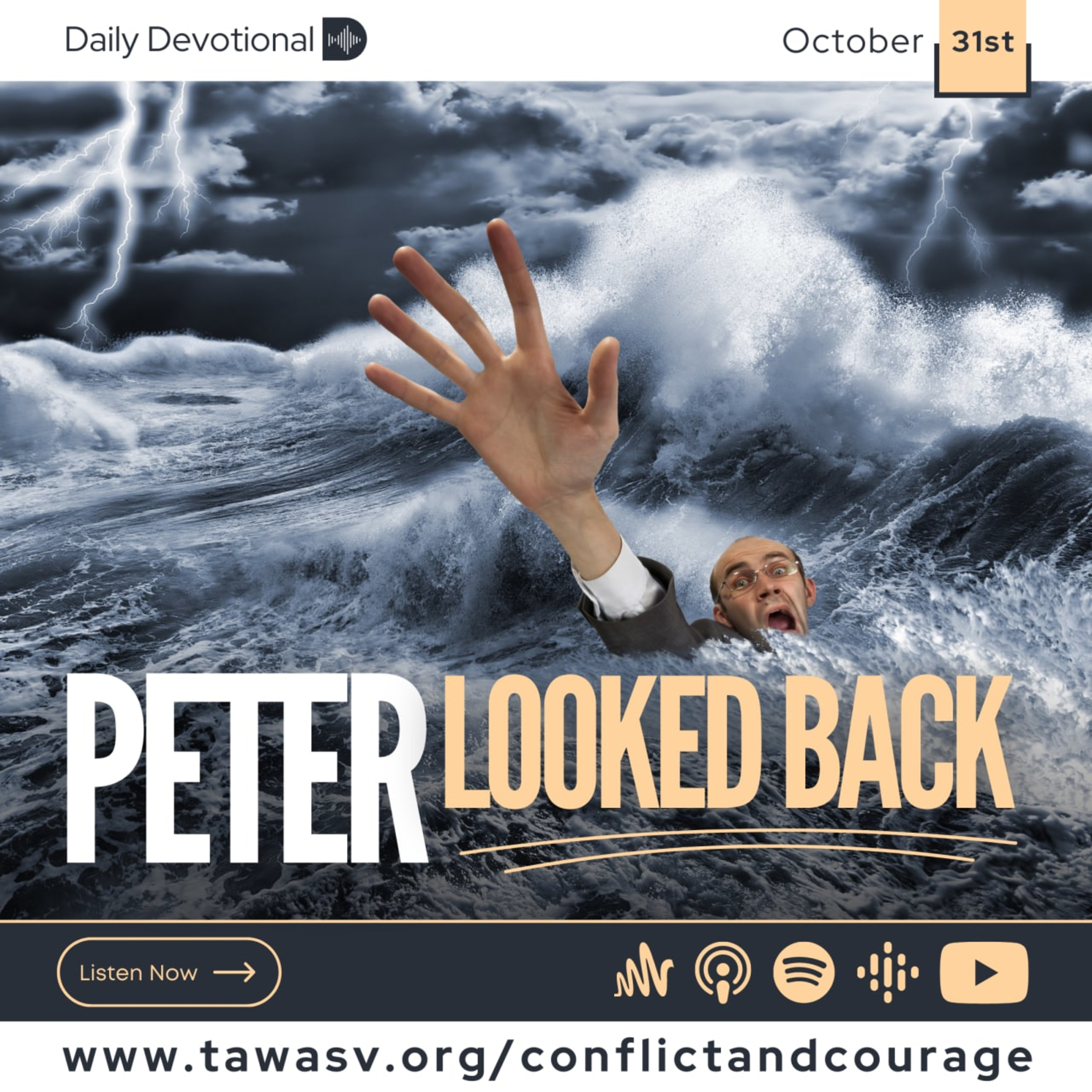 Looking unto Jesus, Peter walks securely; but as in self-satisfaction he glances back toward his companions in the boat, his eyes are turned from the Saviour. The wind is boisterous. The waves roll high. . . . For a moment Christ is hidden from his view, and his faith gives way. He begins to sink. But while the billows talk with death, Peter lifts his eyes from the angry waters, and fixing them upon Jesus, cries, "Lord, save me." Immediately Jesus grasps the outstretched hand, saying, "O thou of little faith, wherefore didst thou doubt?" {CC 310.2}
