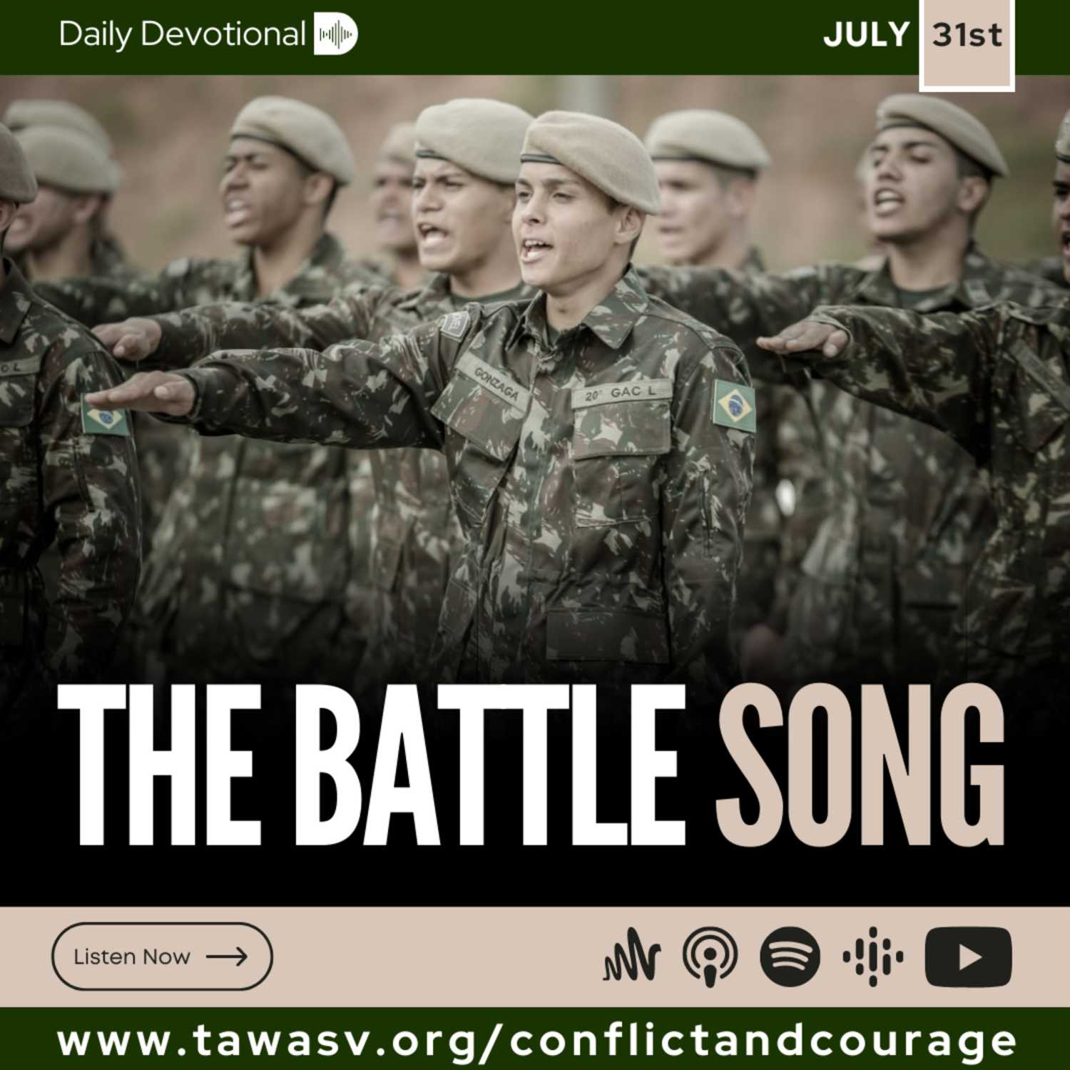 The Battle Song, Conflict and Courage, July 31And when he had consulted with the people, he appointed singers unto the Lord, and that should praise the beauty of holiness, as they went out before the army, and to say, Praise the Lord; for his mercy endureth for ever. 2 Chronicles 20:21. {CC 218.1} It was a singular way of going to battle against the enemy’s army–praising the Lord with singing, and exalting the God of Israel. This was their battle song. They possessed the beauty of holiness. If more praising of God were engaged in now, hope and courage and faith would steadily increase. And would not this strengthen the hands of the valiant soldiers who today are standing in defense of truth? {CC 218.2} They praised God for the victory, and four days thereafter the army returned to Jerusalem, laden with the spoils of their enemies, singing praise for the victory won. {CC 218.3} When we have a deeper appreciation of the mercy and loving- kindness of God, we shall praise Him, instead of complaining. We shall talk of the loving watchcare of the Lord, of the tender compassion of the Good Shepherd. The language of the heart will not be selfish murmuring and repining. Praise, like a clear, flowing stream, will come from God’s truly believing ones. . . . {CC 218.4} Why not awake the voice of spiritual song in the days of our pilgrimage? . . . We need to study God’s Word, to meditate and pray. Then we shall have spiritual eyesight to discern the inner courts of the celestial temple. We shall catch the notes of thanksgiving sung by the heavenly choir around the throne. When Zion shall arise and shine, her light will be most penetrating, and songs of praise and thanksgiving will be heard in the assembly of the saints. Little disappointments and difficulties will be lost sight of. {CC 218.5} The Lord is our helper. . . . No one ever trusted God in vain. He never disappoints those who put their dependence on Him. If we would only do the work that the Lord would have us do, walking in the footsteps of Jesus, our hearts would become sacred harps, every chord of which would send forth praise and thanksgiving to the One sent by God to take away the sin of the world. {CC 218.6}