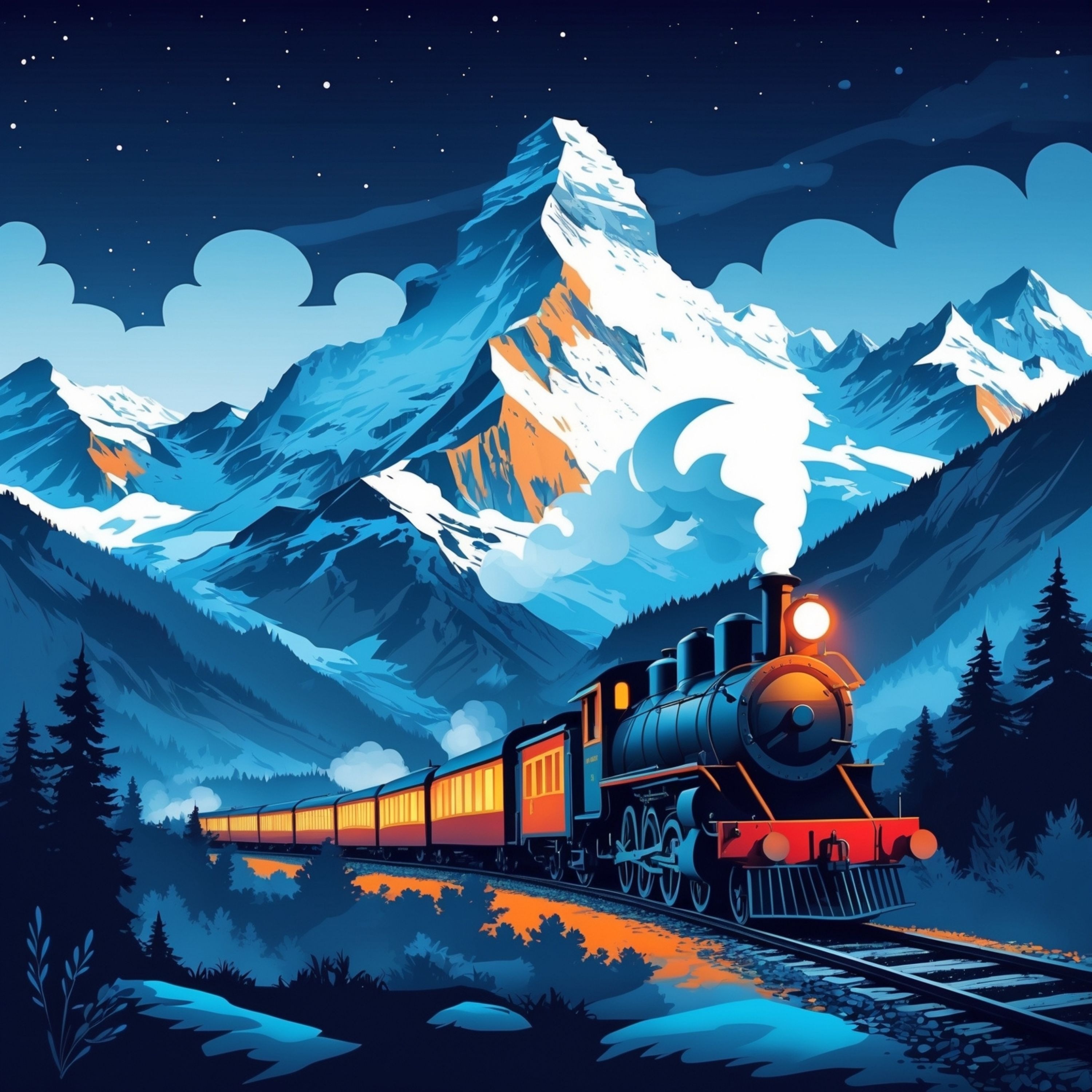 Take a magical train journey, leaving a station, travelling through open countryside, into a forest towards a mountain range, through the mountain tunnel and along the far side of the mountain through a snowy wonderland, before settling down in a sleeper cabin and drifting peacefully asleep.