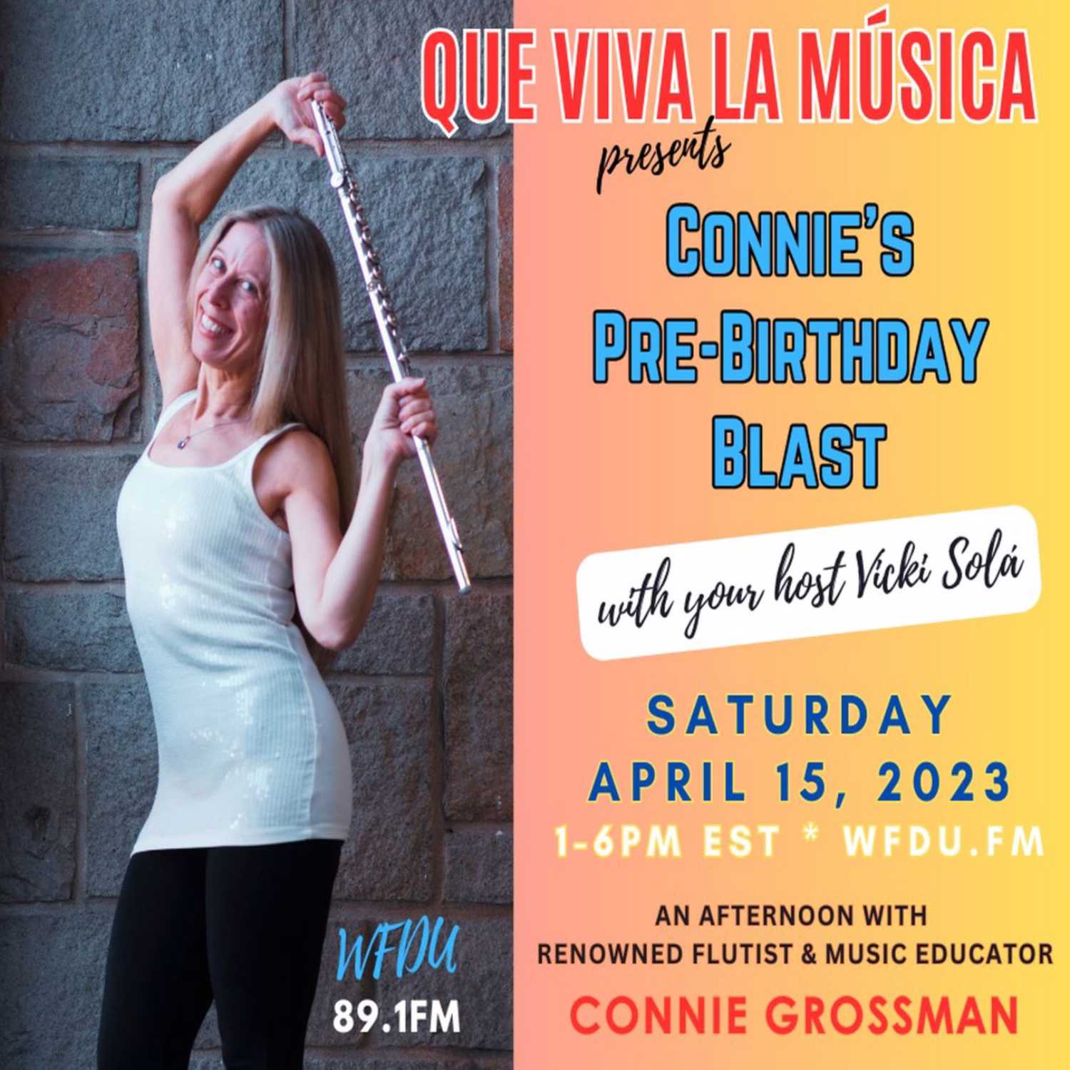 Time to celebrate! LISTEN this Saturday, April 15, 2023 from 1-6pm ET for “Connie’s Pre-Birthday Blast” with special guest and multi-award winning flutist Connie Grossman. This special broadcast will be co-hosted by QVLM founder Vicki Solá!It’s a show you won’t want to miss as we will be treated to Connie’s musical selections spanning her trajectory as a performer and recording artist, plus some of her favorites and more! Join us for the party!TUNE IN on WFDU 89.1 FM on your radio dial. Stream it live around the globe at www.wfdu.fm, or via your mobile device/tablet on the free WFDU app. Live streams are also available on iHeart and TuneIN websites and mobile app!
