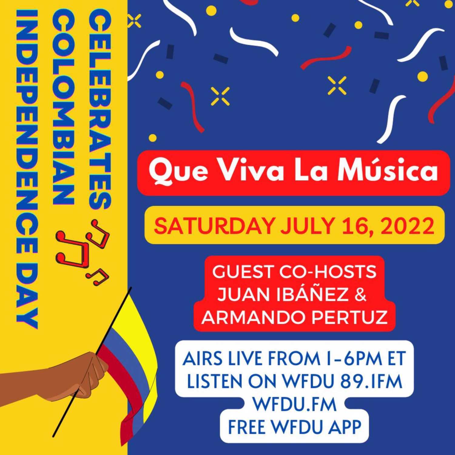 Listen in to another special LIVE broadcast of Que Viva La Musica, -- it's our annual "Colombian Independence Day Celebration" with our QVLM family member Juan Ibañez and Manuel in the studio to bring you music, culture, history and SABOR! Tune in for great music honoring the beautiful people of Colombia!!