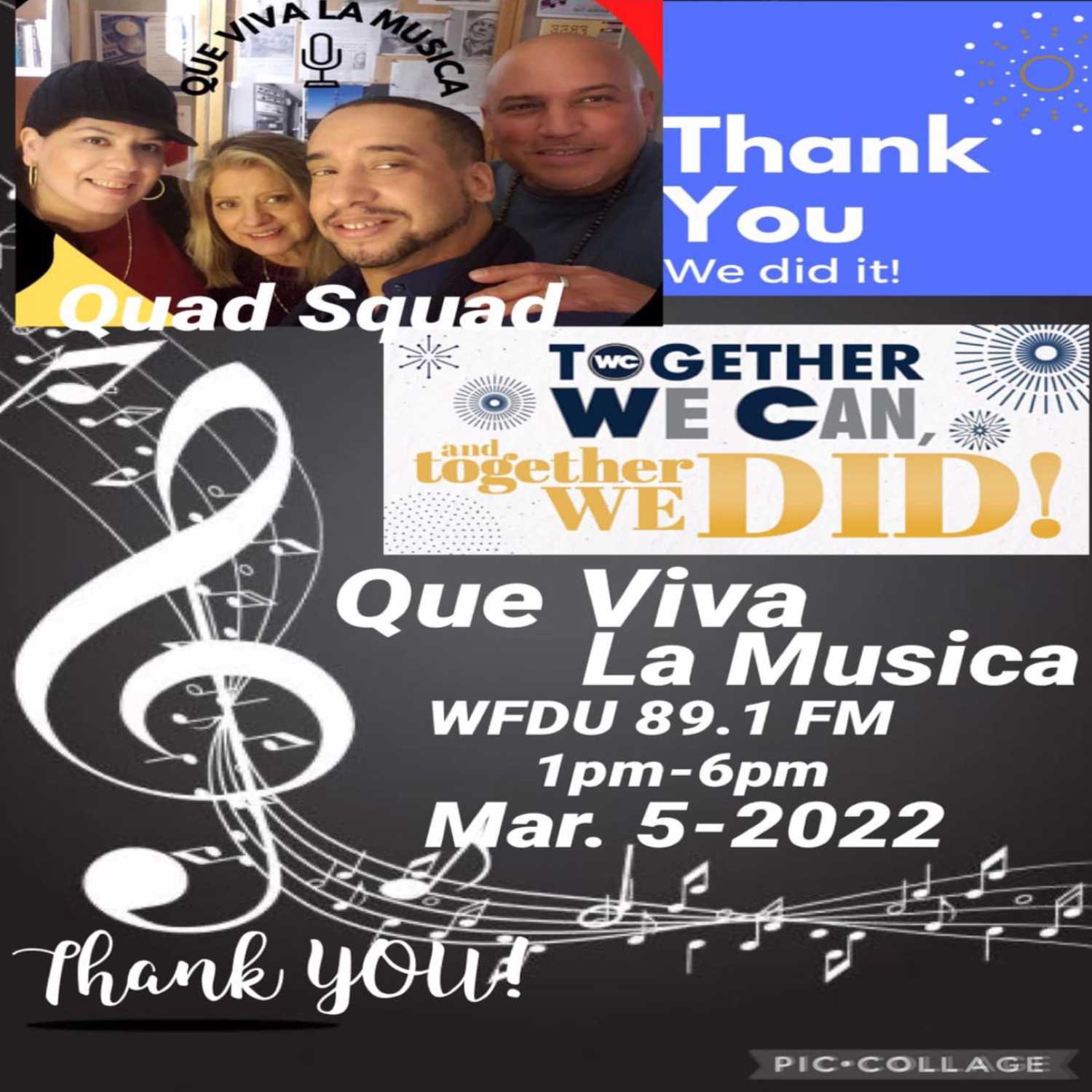 We Did it!! Que Viva La Musica WFDU 89.1 FM & The Quad Squad Thanks YOU for Helping us stay on air for one more year!!! Thank you so very much for your donations & pledges!! Please tune in Sat. March 5-2022 WFDU 89.1 FM 1pm-6pm for some New & Classic Music with minimal interruptions! With Queen Vicki Solá, DJ Marysol N C RodrĂguez, DJ Jose Calderon, DJ King Louie, Louis Vazquez!!Tune in several ways:-RADIO; 89.1 FM In the NYC Metro area.-INTERNET; wfdu.fm; TuneIn.com -MOBILEAPP; WFDU; Simple Radio(Search for WFDU); TuneIn#QueVivaLaMusica
