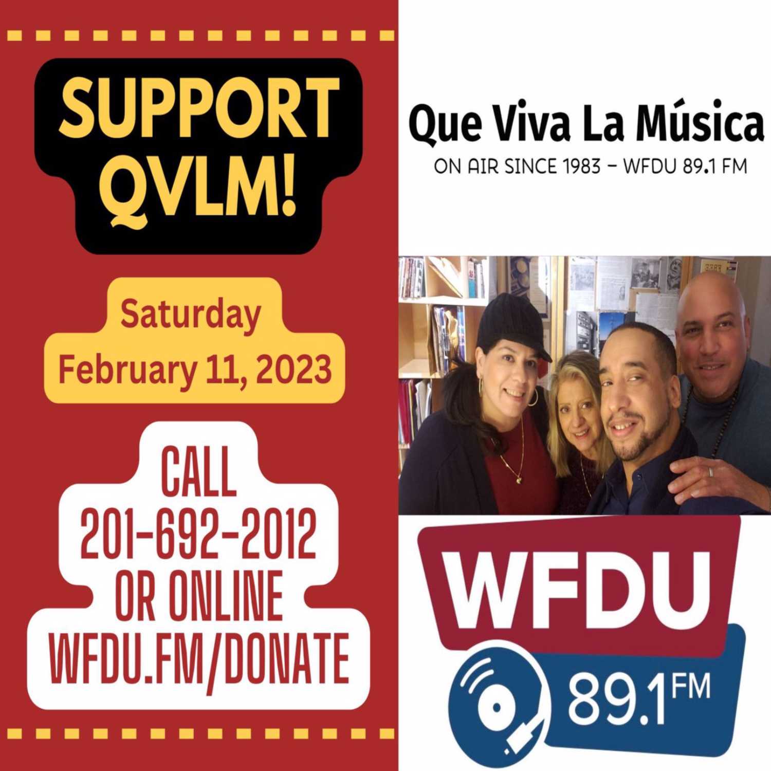 QUE VIVA LA MUSICA! Support non-commercial radio and your favorite music on the FM dial! It's our once-a-year fund drive to raise money for WFDU 89.1fm. Keep us on air another year by donating in any amount!We are LIVE this Saturday 2/11/23 from 1-6pm. DONATE ONLINE wfdu.fm/donate or call us 201-692-2012 to make your pledge.KEEP SALSA ON THE AIRWAVES! #qvlm