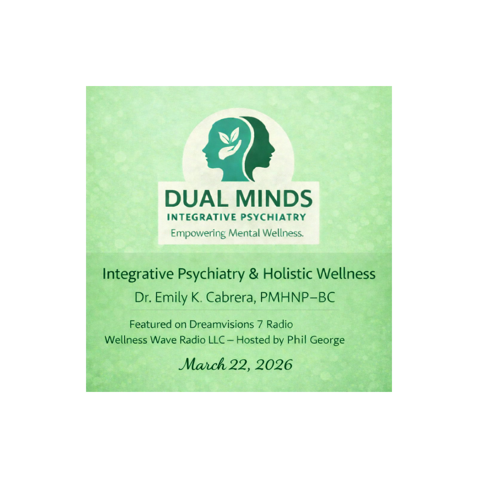 On March 22, 2026, Emily K. Cabrera, PMHNP-BC, joined Wellness Wave Radio LLC, hosted by biochemist Phil George, on Dreamvisions 7 Radio for a conversation focused on first responders and trauma.