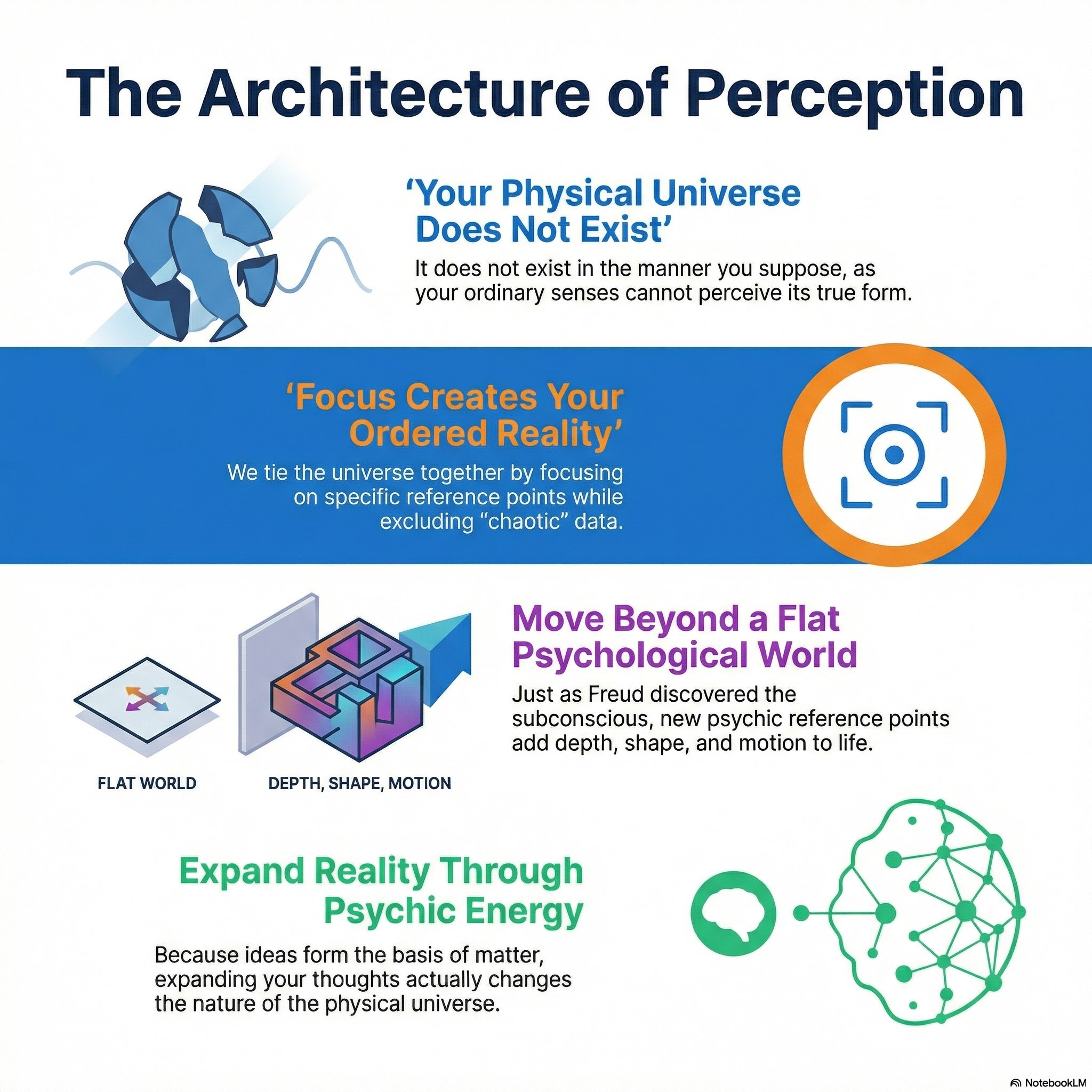 According to Seth, we only see a "physical" world because we focus on specific reference points and ignore everything else. If we actually perceived all the data available, our physical world would be "lost in a maze of seemingly chaotic data."