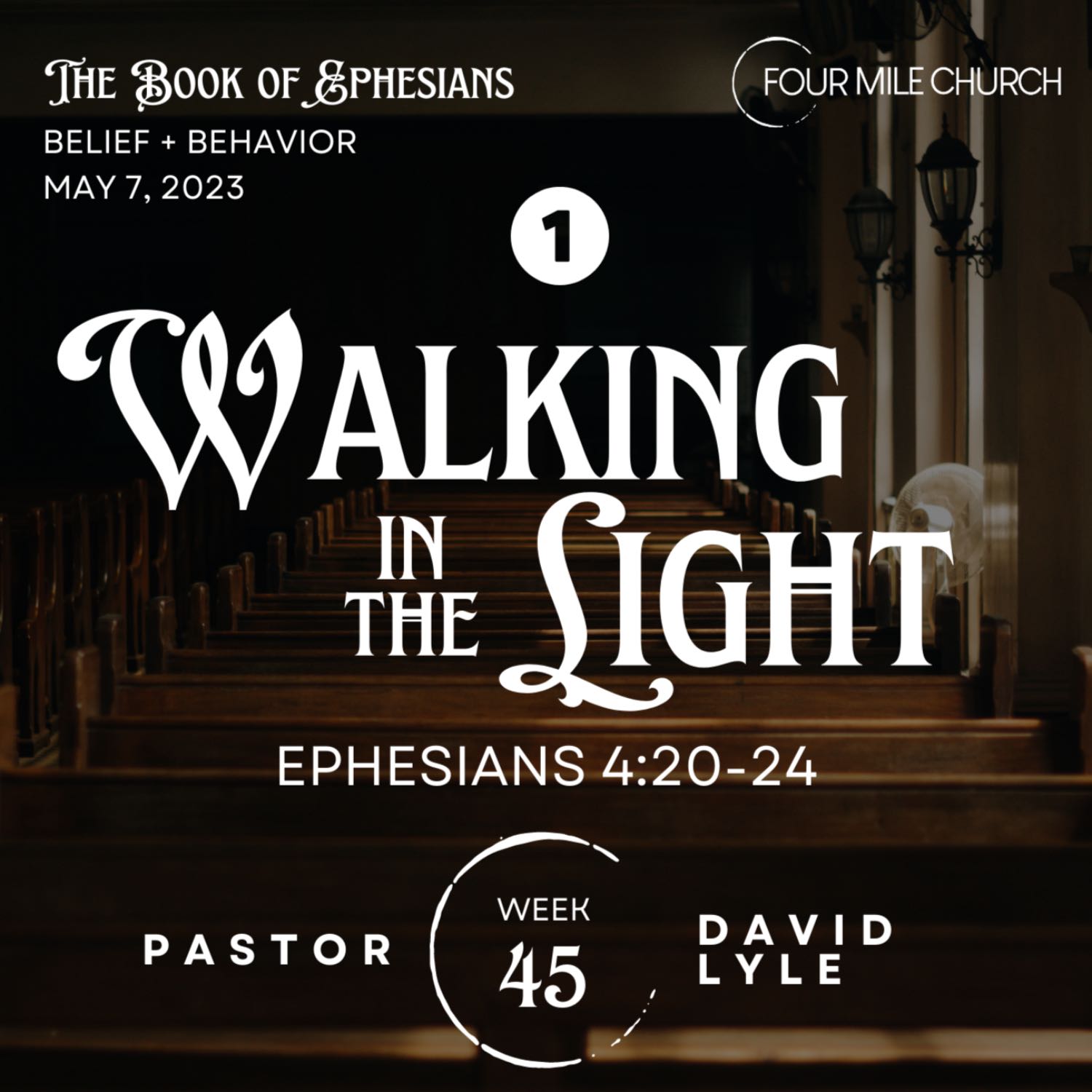 May 7, 2023 Walking in the Light (1) Ephesians 4:20-24 “But that is not the way you learned Christ!— assuming that you have heard about him and were taught in him, as the truth is in Jesus, to put off your old self, which belongs to your former manner of life and is corrupt through deceitful desires, and to be renewed in the spirit of your minds, and to put on the new self, created after the likeness of God in true righteousness and holiness."YouTube link