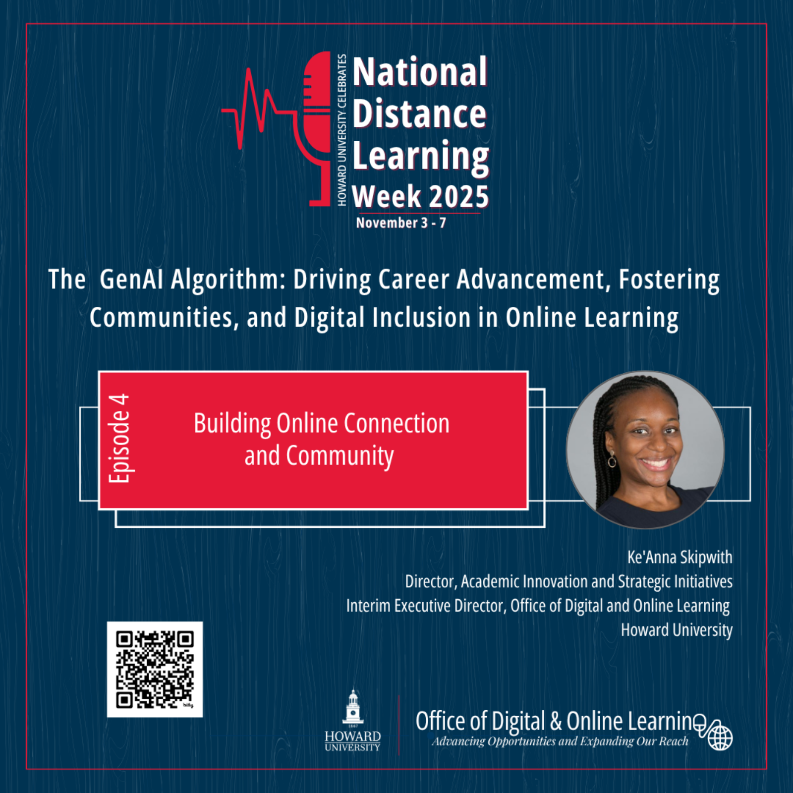 In the latest episode on the Digital and Online Learning podcast (DOL POD), we welcome Ke'Anna Skipwith, Director of Academic Innovation and Strategic Initiatives and Interim Executive Director for Digital and Online Learning at Howard University. This episode examines the development of genuine connections and community in online learning, from fostering a sense of belonging among distance learners to intentional course design and the evolving role of instructors. Ms. Skipwith shares practical strategies and insights from her book, Best Practices in Engaging Online Learners Through Active and Experiential Learning Strategies, as well as her experience and research, including the transformative power of AI in education and how adaptive technologies can make learning more inclusive.