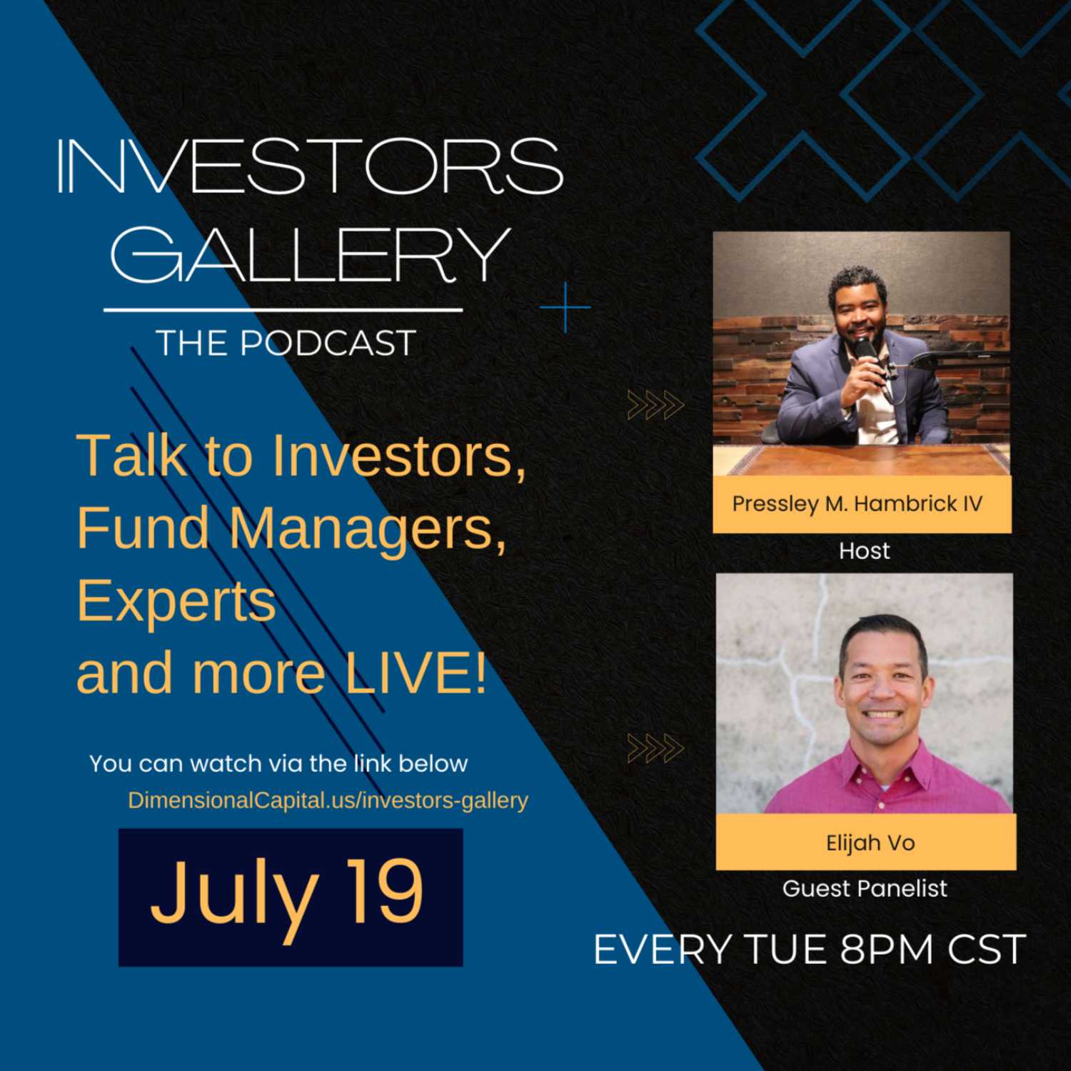 Investors Gallery is a live Zoom open to the public where Investors, Fund Managers, Experts and more come to talk about their industries, investments, and opportunities. Investors Gallery is recorded and filmed in the Art Gallery built in the home of the Principle of Dimensional Capital Partners Pressley Hambrick's home.