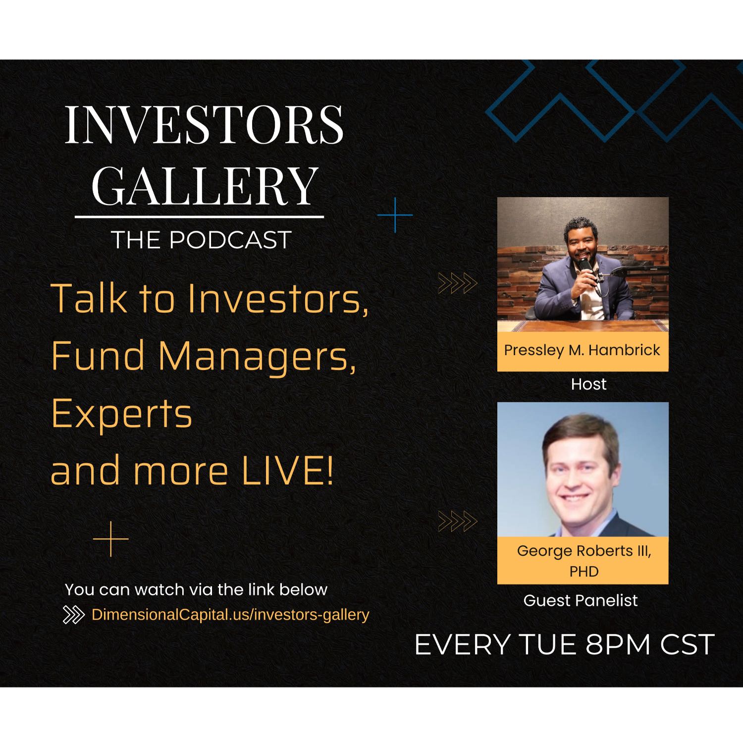 Investors Gallery is a live Zoom open to the public where Investors, Fund Managers, Experts and more come to talk about their industries, investments, and opportunities. Investors Gallery is recorded and filmed in the Art Gallery built in the home of the Principle of Dimensional Capital Partners Pressley Hambrick's home.