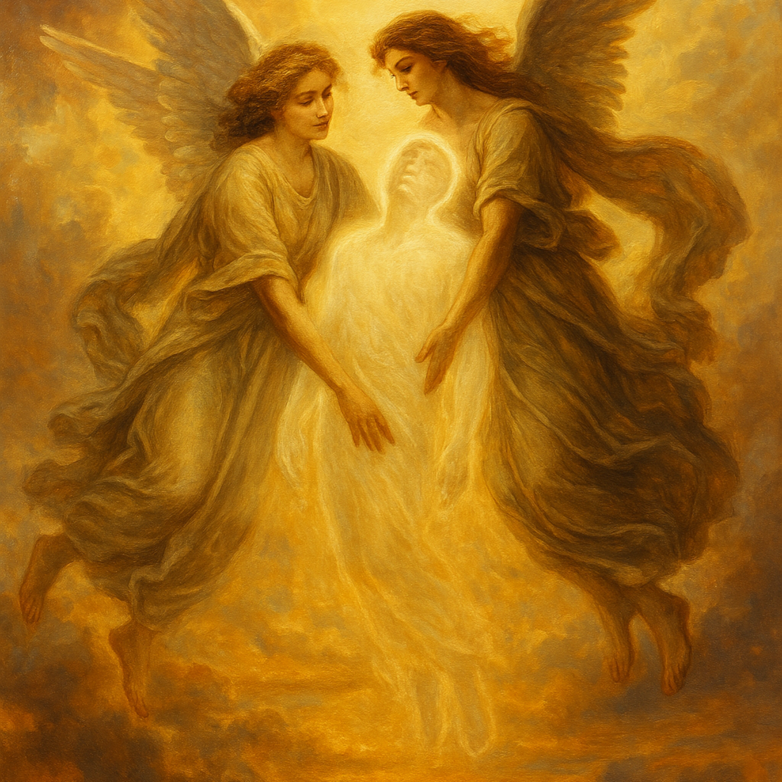 Religious song, dying being escorted to heaven gate, spiritual, uplifting, finality’s