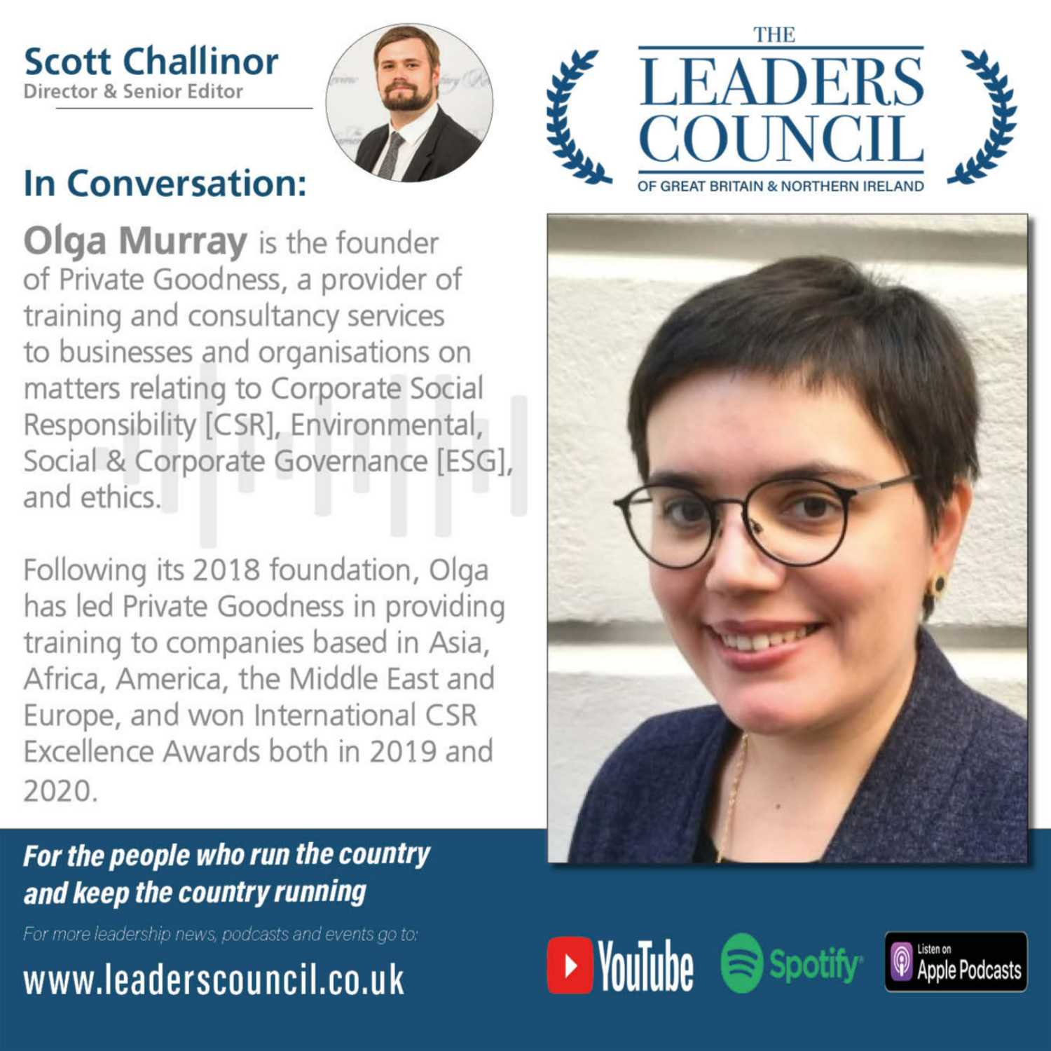 Olga Murray is the founder of Private Goodness, a provider of training and consultancy services to businesses and organisations on matters relating to Corporate Social Responsibility [CSR], Environmental, Social & Corporate Governance [ESG], and ethics.