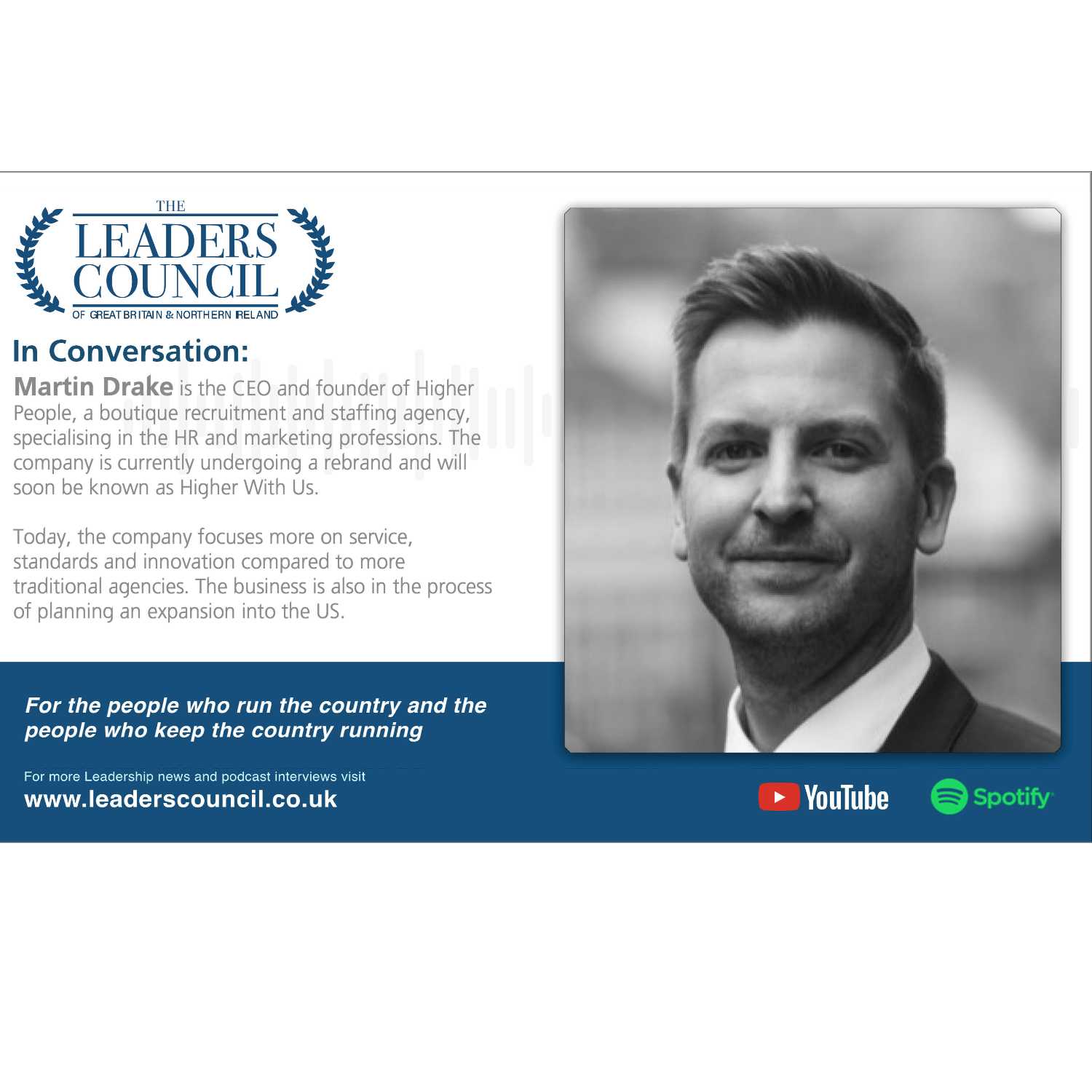 Martin Drake is the CEO and founder of Higher People, a boutique recruitment and staffing agency, specialising in the HR and marketing professions. The company is currently undergoing a rebrand and will soon be known as Higher With Us.
