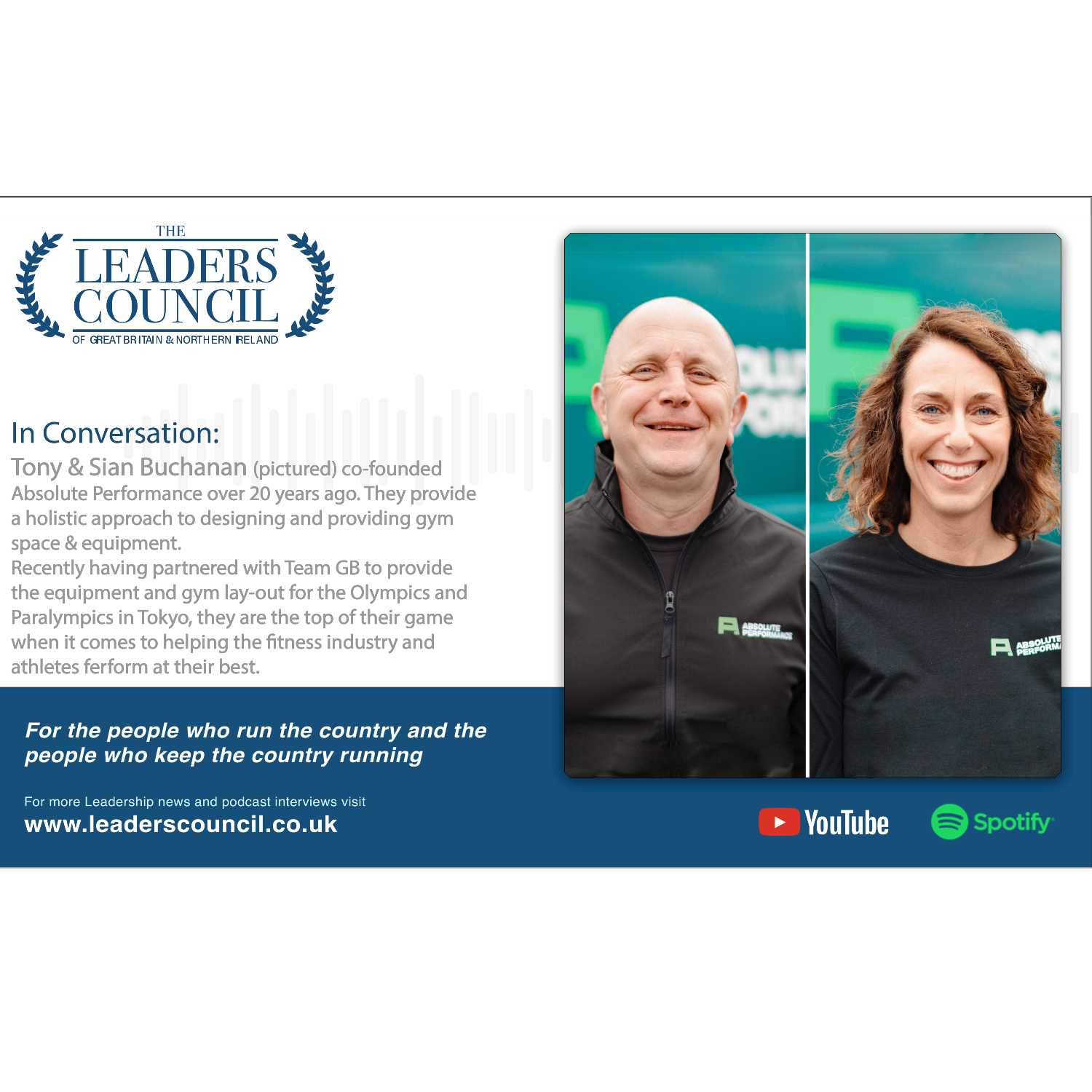 Tony & Sian Buchanan (pictured) co-founded Absolute Performance over 20 years ago. They provide a holistic approach to designing and providing gym space & equipment.