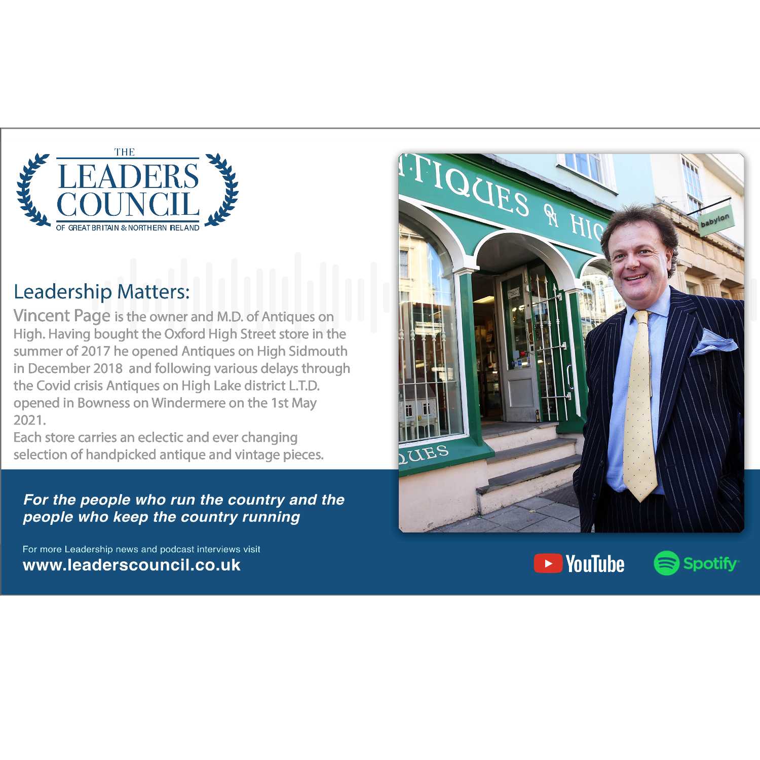 Vincent Page is the owner and M.D. of Antiques on High. Having bought the Oxford High Street store in the summer of 2017 he opened Antiques on High Sidmouth in December 2018 and following various delays through the Covid crisis Antiques on High Lake district L.T.D. opened in Bowness on Windermere on the 1st May 2021.