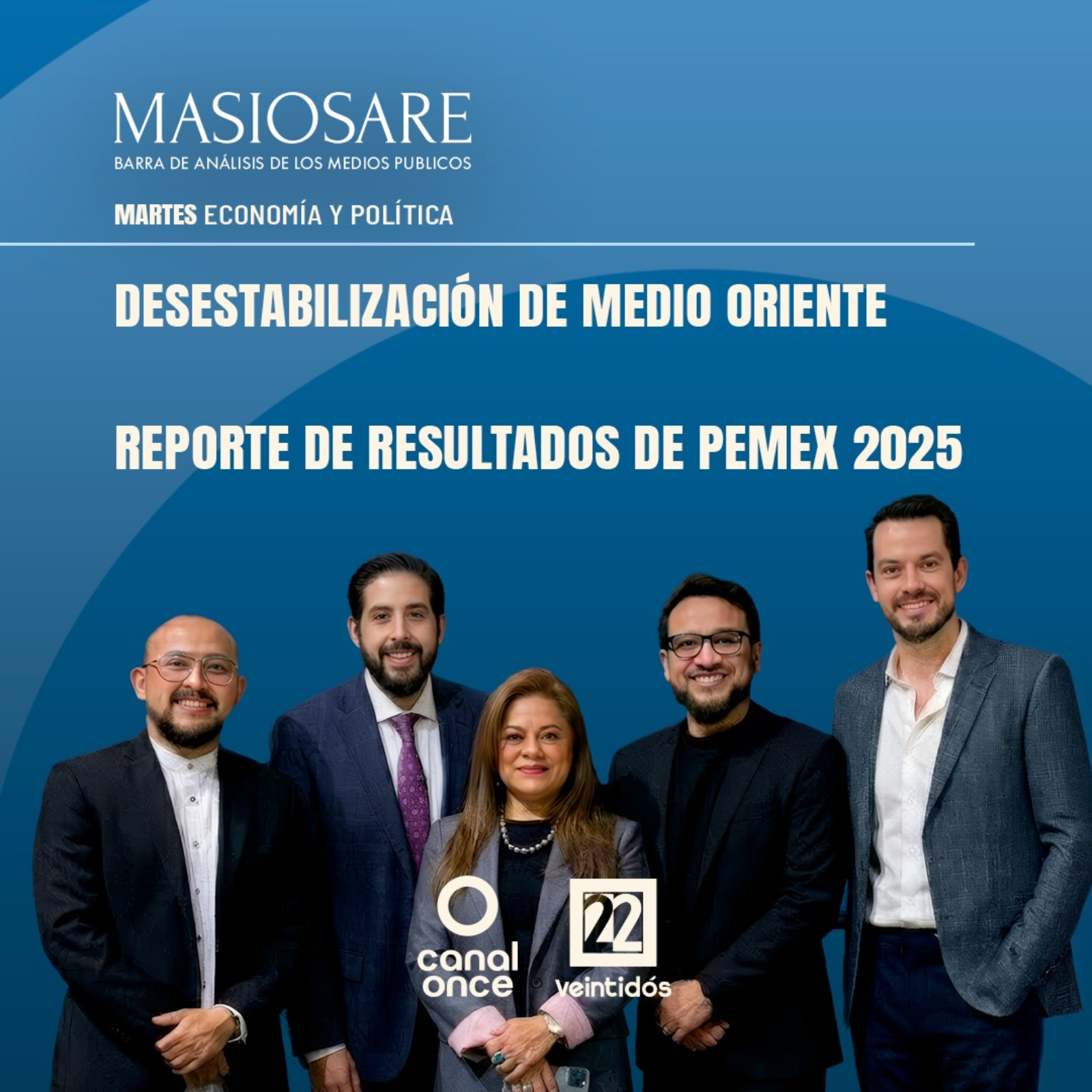 Masiosare es la barra de opinión de los medios públicos donde se discutirán y analizarán los temas que ocupan a la vida pública nacional e internacional desde el periodismo, la economía, el derecho, los discursos y la historia. Esta noche nuestros panelistas Tonatiuh Martínez, Claudia Villegas, Hamlet Almaguer, Paul Ospital y Óscar Rojas analizarán la desestabilización de Medio Oriente y el reciente reporte de resultados de PEMEX.