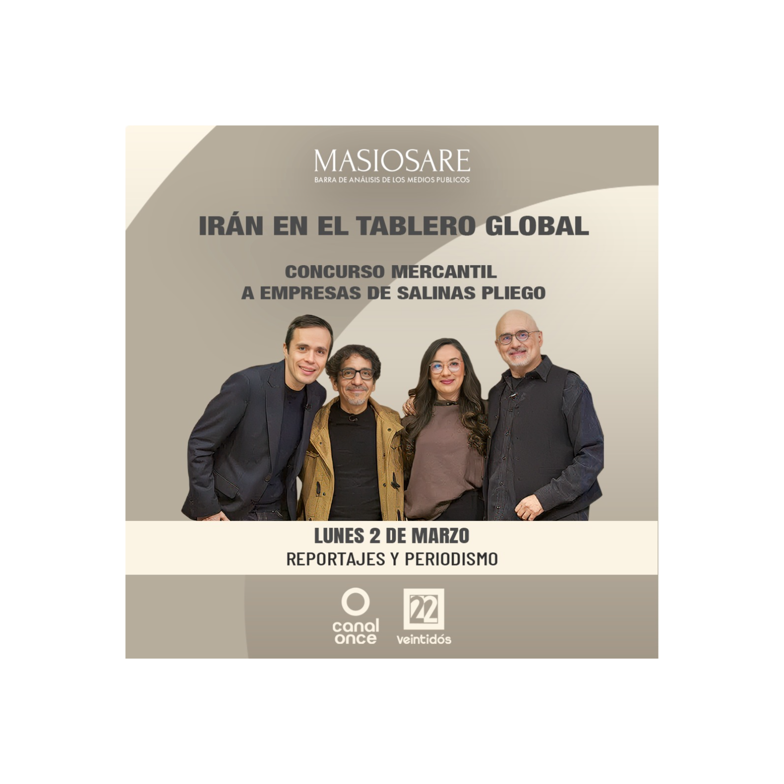 Masiosare es la barra de opinión de los medios públicos donde se discutirán y analizarán los temas que ocupan a la vida pública nacional e internacional desde el periodismo, la economía, el derecho, los discursos y la historia. Hoy nuestros panelistas José Hernández, Laura Sánchez-Ley, Fabrizio Mejía y Jorge Armando Rocha hablarán sobre los ataques recientes a Irán y el concurso mercantil de las empresas de Salinas Pliego.